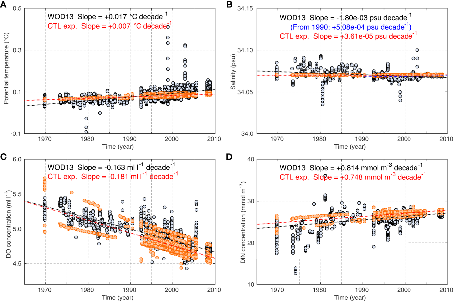 Long-term variation in (A) temperature, (B) salinity, (C) dissolved oxygen (DO) concentration, and (D) dissolved inorganic nitrogen (DIN) concentration at depths from 1500 m to the bottom. The gray and orange circles indicate the observation data and results of the control (CTL) experiment, respectively. The dotted lines denote the linear regression lines of each dataset. All linear trends were statistically significant at a confidence level of 95% (p < 0.05).