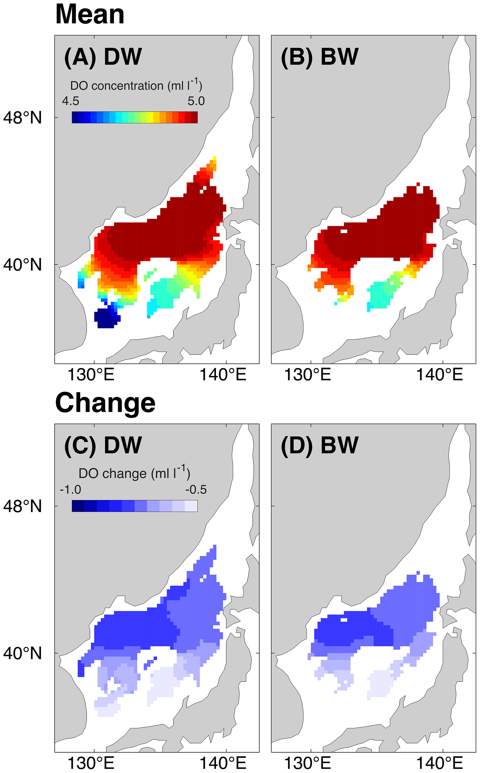 Spatial distribution of the mean dissolved oxygen (DO) concentration (upper panel) and its changes (lower panel) for the 36-year period (1980 to 2015) of the control (CTL) experiment in the depth range from (A, C) 1618 to 2250 m (deep water: DW) and (B, D) 2250 m to the bottom (bottom water: BW).