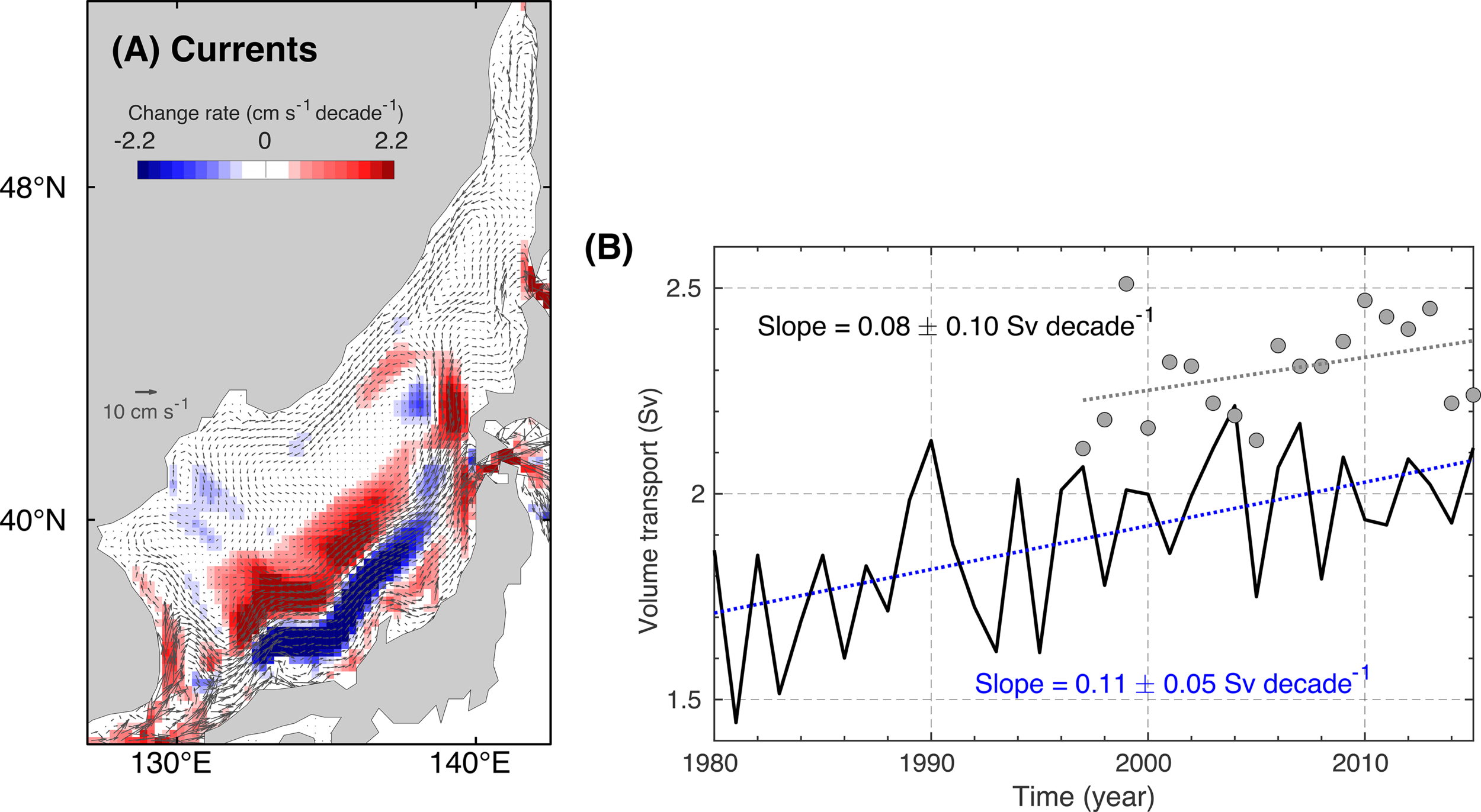 (A) Spatial distribution of the linear trend in current speed (color) of the 36-year period (1980 to 2015). The vector indicates the mean current. (B) Time series of the volume transport through the Korea/Tsushima Strait obtained from the model (solid line) and the direct measurements by the Acoustic Doppler Current Profiler (circles).