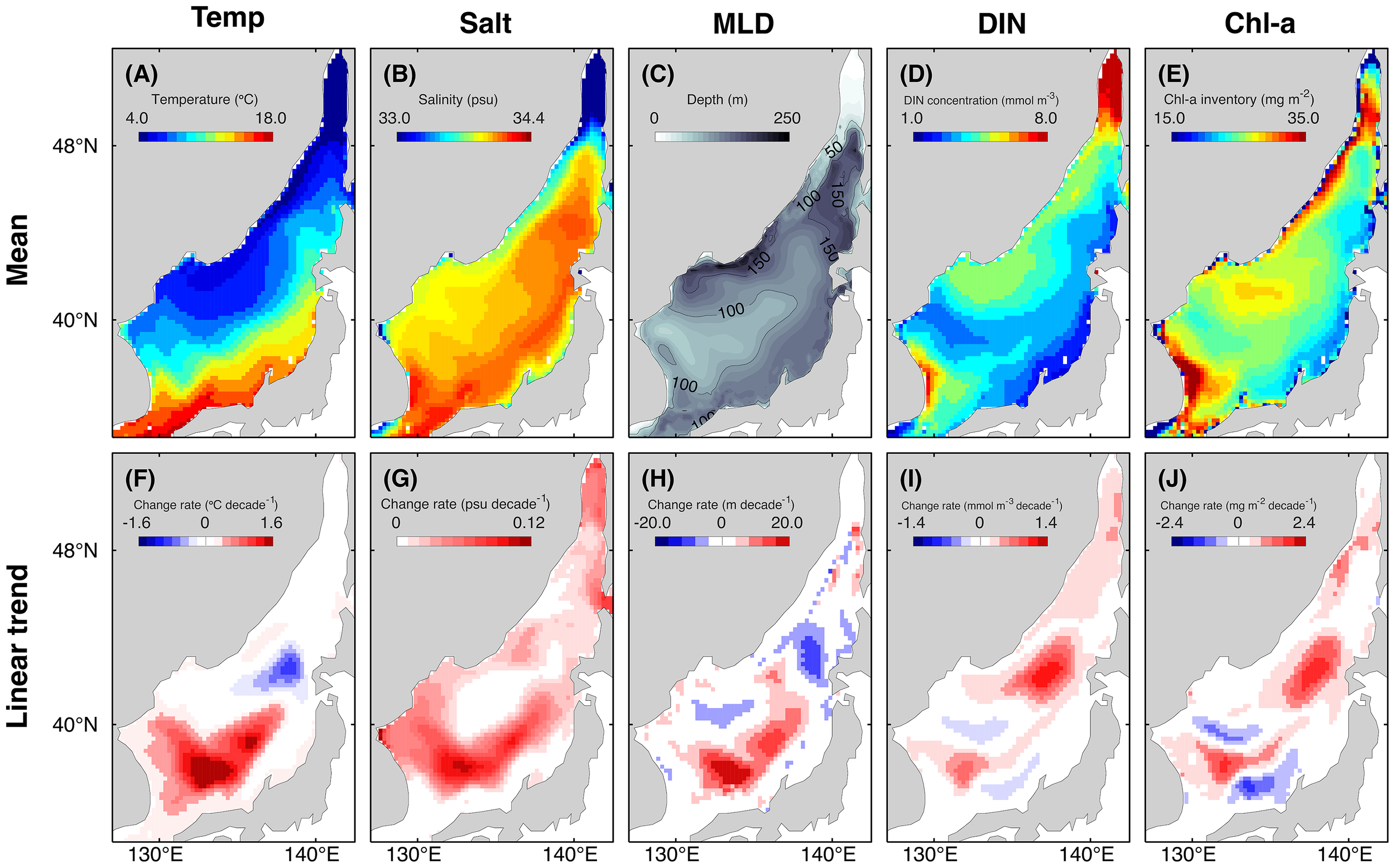 Spatial distributions of the mean (upper panel) and linear trends (lower panel) of the control (CTL) experiment over the 36-year period (1980 to 2015): (A, F) temperature, (B, G) salinity, (C, H) mixed layer depth (MLD), (D, I) dissolved inorganic nitrogen (DIN) concentration, and (E, J) chlorophyll-a (Chl-a) inventory. Temperature, salinity, DIN and Chl-a patterns indicate the annual mean and are averaged from the surface to a depth of 110 m. The spatial patterns of the mean and linear trend of the MLD denote the average in the winter season.