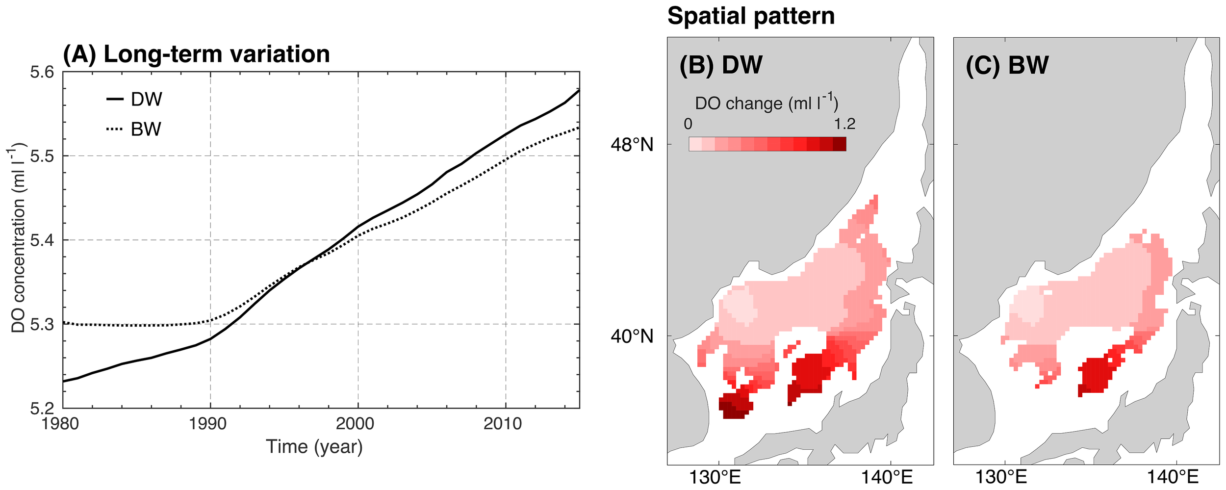 In this study, the model-defined DW and BW correspond to the depths from 1618 to 2250 m and from 2250 m to the bottom, respectively, in accordance with the vertical grid thickness of the model. The DO concentration was generally higher in the BW than in the DW (average concentrations were 4.95 and 4.88 ml l−1, respectively). This vertical structure results from a more vigorous detritus decomposition process in the DW than in the BW. The biological consumption decreases as the detritus concentration decreases with increasing depth. The DO concentration consistently decreased from 1980 to 2015. The reduction in the DO concentration over the 36-year period was 0.686 and 0.687 ml l−1 in the deep and bottom waters, respectively. The decreasing trend in the DO concentration of the BW reproduced by the model (0.19 ml l−1 decade−1) was almost the same scale as that of the observation data (0.17 ml l−1 decade−1) reported by Gamo (1999).
