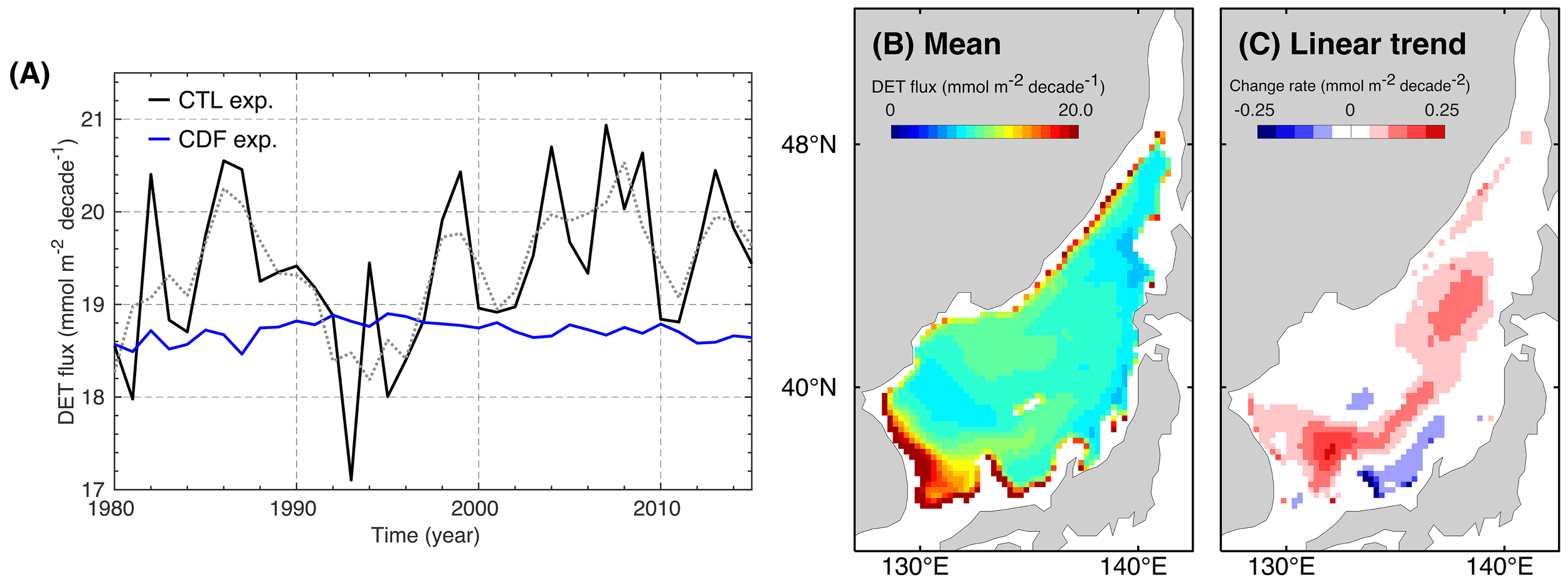 (A) Long-term variation in the detritus (DET) flux into the lower layers averaged in the East/Japan Sea, which is determined by the incoming flux through 516 m depth and the outgoing flux of the sedimentation at the bottom. The black and blue solid lines indicate the results of the control (CTL) and constant detritus flux (CDF) experiments, respectively. The gray dotted line represents the 3-year moving average of the detritus flux simulated by the CTL experiment. (B) Spatial distribution of the mean detritus flux and (C) spatial pattern of the linear trend in the detritus flux of the CTL experiment.