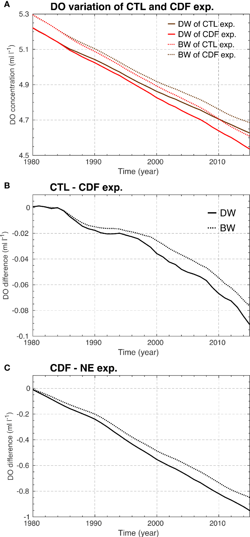 Here, we discuss three causes underlying long-term decrease in DO concentration in the deep and bottom layers: 1. Physical effect including advection, diffusion, and air-sea gas exchange; 2. Effect of the increased organic particles inflowed from the upper ocean; and 3. Impact of cessation of new water formation (leads to the sustained biological consumption). The influences of one physical and two biological factors are described by the NE experiment, the difference between the CTL and the CDF experiments, and the difference between the CDF and the NE experiments, respectively.
