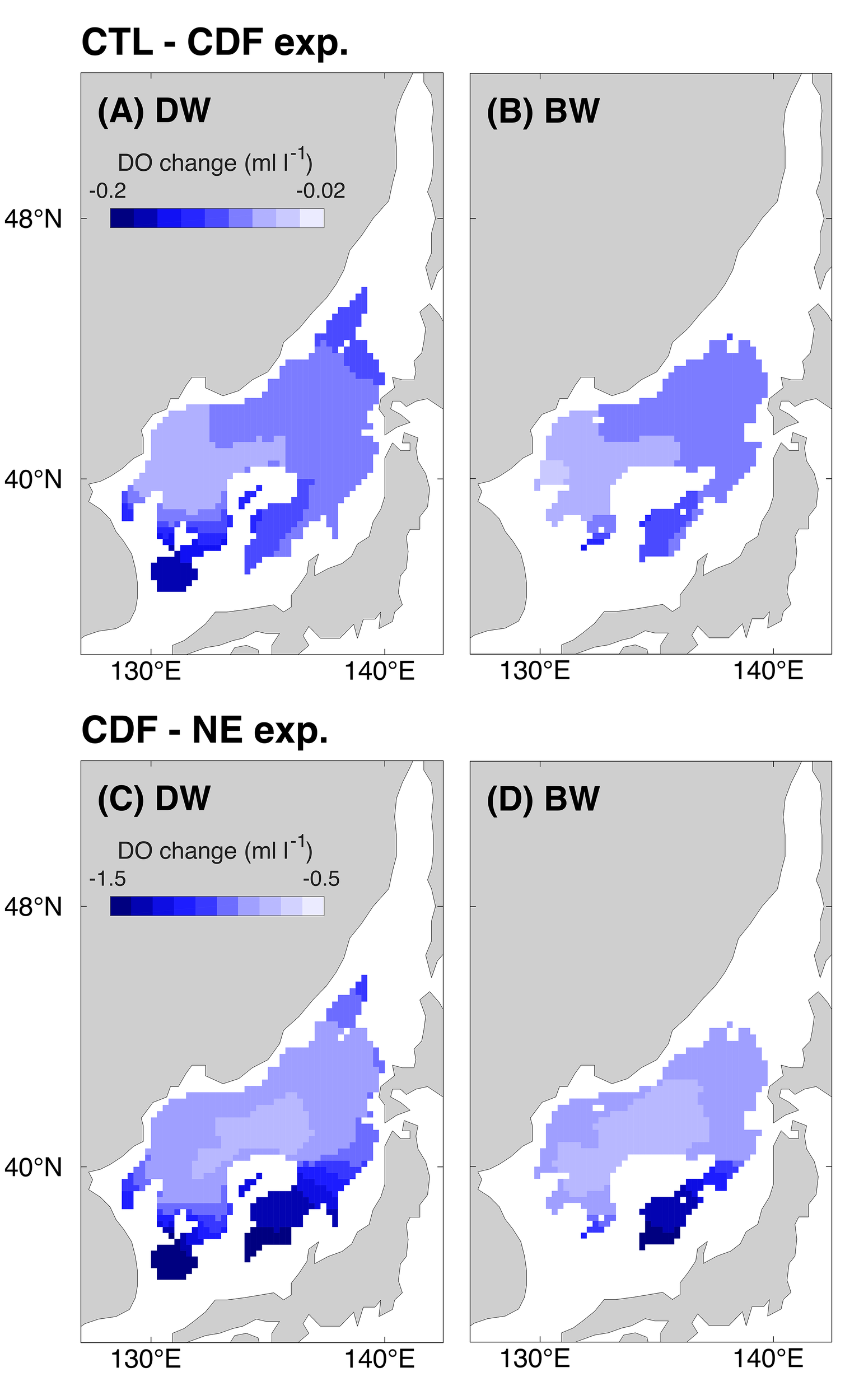 Spatial distribution of the changes in the dissolved oxygen (DO) difference (A, B) between the control (CTL) and the constant detritus flux (CDF) experiments; and (C, D) between the CDF and the no-ecosystem (NE) experiments for the 36-year period (1980 to 2015) in the depth range from 1618 to 2250 m (deep water: DW) and 2250 m to the bottom (bottom water: BW).