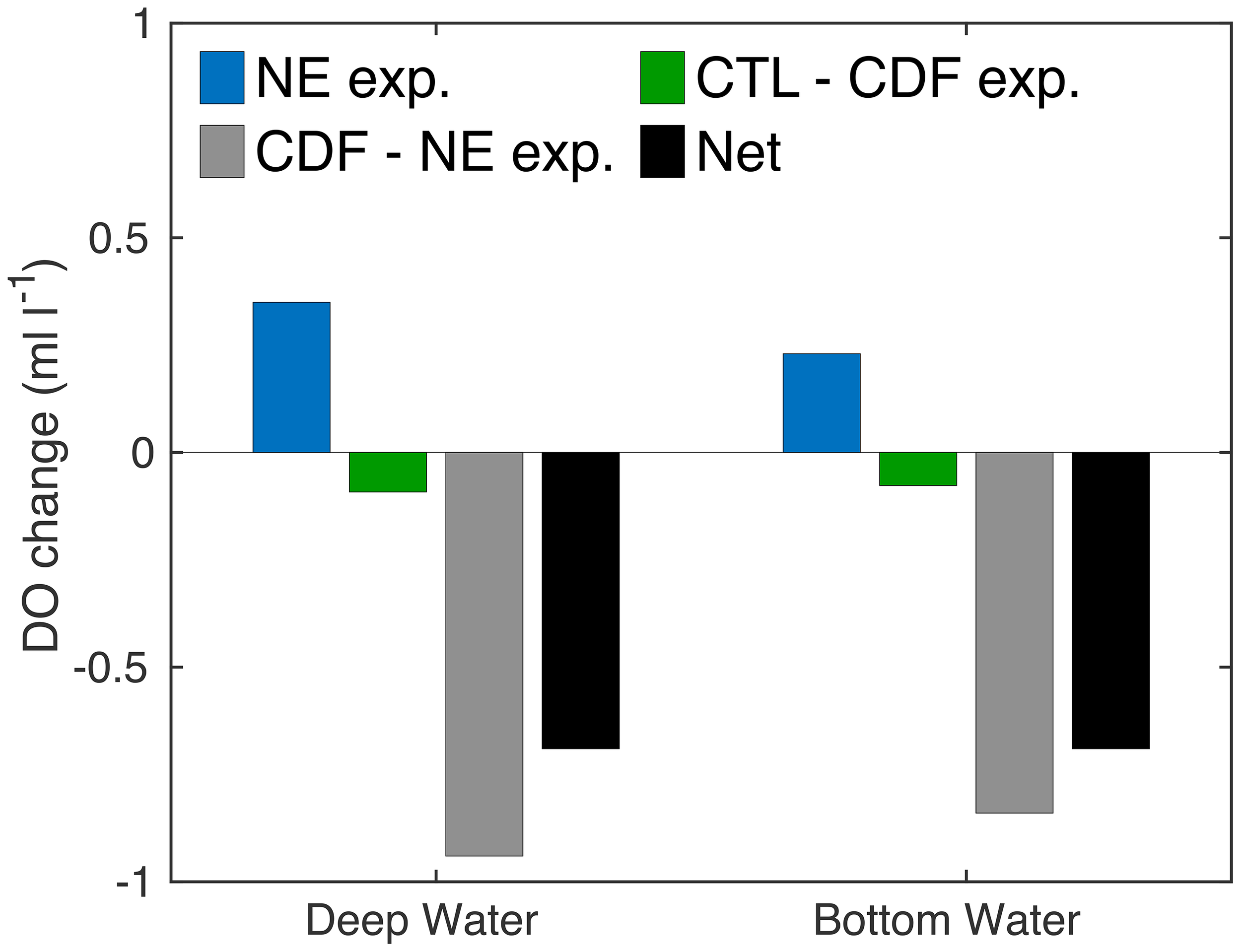 Changes in the dissolved oxygen (DO) concentration over the 36-year period (1980 to 2015) at each depth range from 1618 to 2250 m (deep water) and 2250 m to the bottom (bottom water). Blue, green, and gray bars indicate the DO change of the no-ecosystem (NE) experiment, the difference between the control (CTL) and constant detritus flux (CDF) experiments, the difference between the CDF and the NE experiments, respectively. The black bar indicates the net change in the DO concentration.