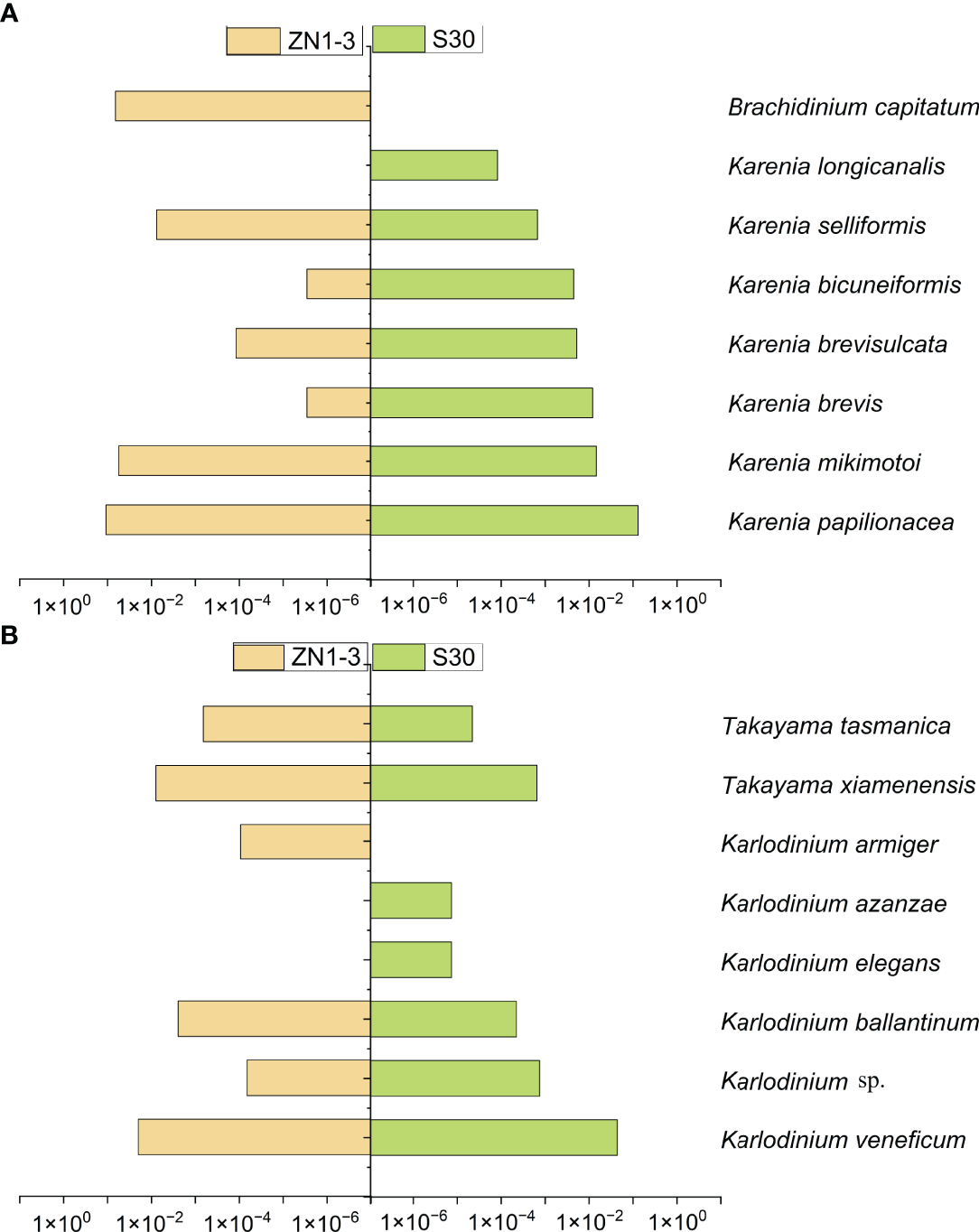 When the family Kareniaceae was first described, 21 species were recorded (Bergholtz et al., 2005; Wang et al., 2018). To date, 37 species have been described (11 Karenia spp., 15 Karlodinium spp., seven Takayama spp., two Asterodinium spp., one Gertia sp. and one Shimiella sp.) and updated in the AlgaeBase database (https://www.algaebase.org/) (Guiry and Guiry, 2022; De Salas et al., 2008; Li and Shin, 2018; Luo et al., 2018; Benico et al., 2019; Takahashi et al., 2019; Cen et al., 2020; Ok et al., 2021). Among them, nine species of Karenia, six species of Karlodinium and one species of Takayama are considered as HAB species based on the HAB taxon list (Lundholm et al., 2009), as detailed in Table S1. There is increasing evidence that multiple Kareniaceae species co-occur or co-dominate in a bloom event. For example, in 2021 a massive HAB in the Pacific coast of eastern Hokkaido, Japan was dominated by K. selliformis, with other Kareniaceae dinoflagellates (K. longicanalis, K. mikimotoi, Karlodinium sp., Takayama cf. acrotrocha, T. tuberculata and Takayama sp.) also present (Iwataki et al., 2022). A Karenia bloom in Hong Kong waters in 2016 was dominated by the species K. mikimotoi and K. papilionacea, with K. selliformis and K. longicanalis also present in low abundance (Lin et al., 2020). Five species of Karenia (K. brevis, K. mikimotoi, K. papilionacea, and K. selliformis and one unknown Karenia species) were isolated and identified in a Karenia bloom along the west coast of Florida from 2007 to 2008 (Wolny et al., 2015). Due to the production of diverse toxins and impacts from multiple species, accurate species identification from environmental samples are crucial for early warning systems and the management of Kareniaceae blooms in coastal waters.