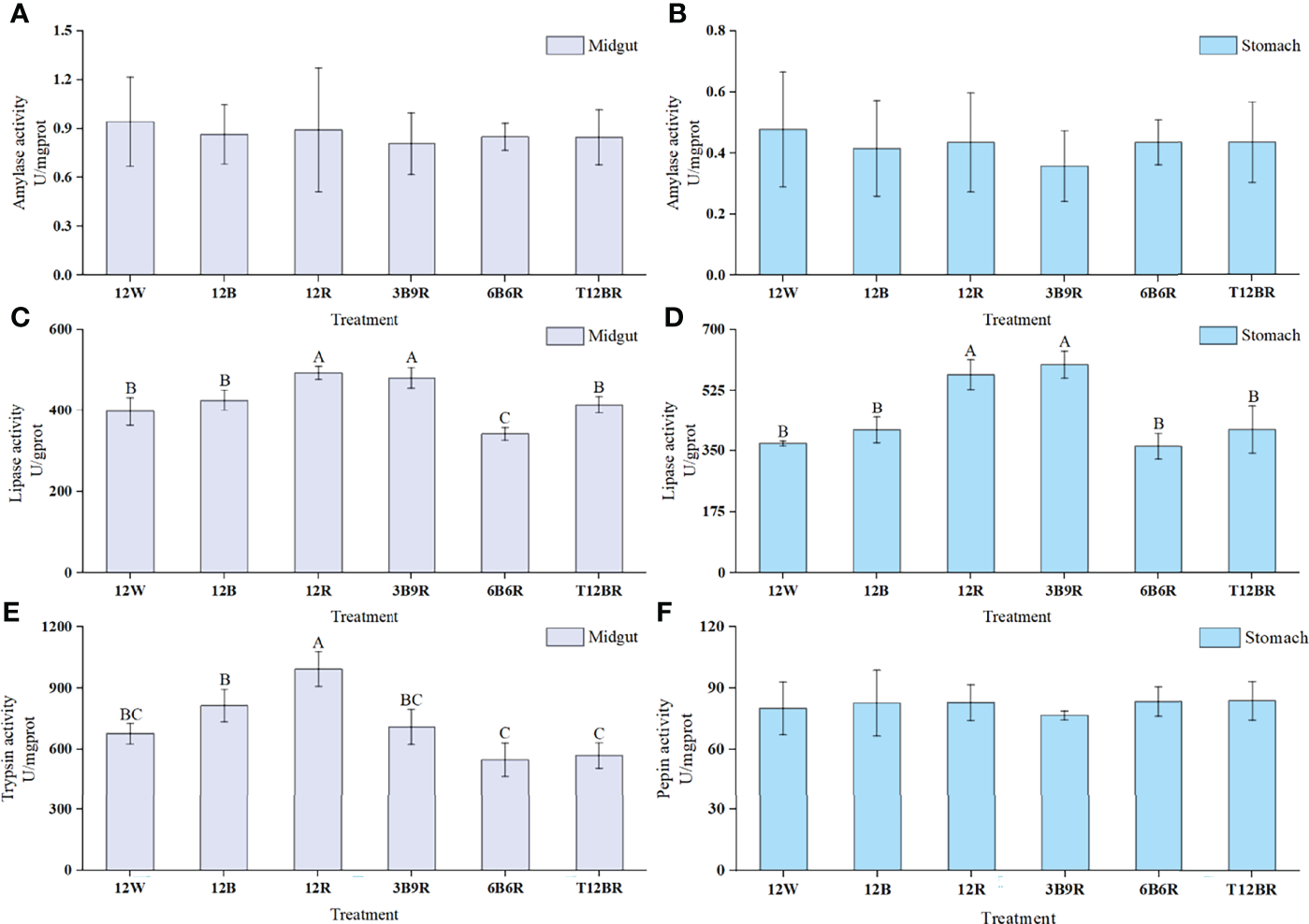 Figure 2 Digestive enzyme activities of the midgut and stomach in juvenile steelhead trout reared under different light color conditions. (A) Amylase activity in the midgut; (B) amylase activity in the stomach; (C) lipase activity in the midgut; (D) lipase activity in the stomach; (E) trypsin activity in the midgut; (F) pepsin activity in the stomach. Different capital letters denote significant differences among the steelhead trout treatments. Results are expressed as mean ± standard deviation (n=12).