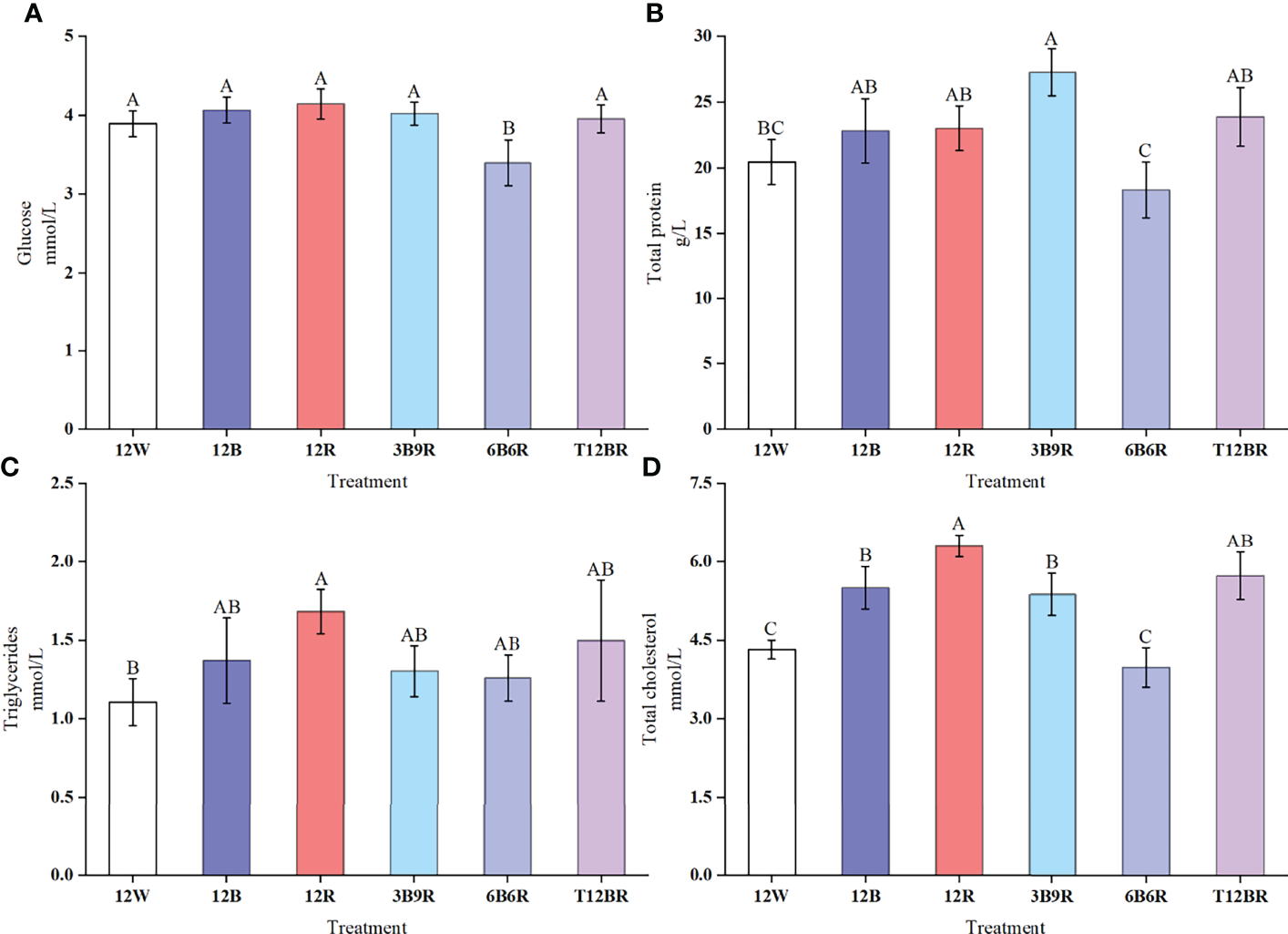 Results obtained for the plasma Glu, TP, TG, and TC levels are presented in Figure 3. Glu levels in trout in the 6B6R group were significantly lower than those in the other groups (P < 0.05). The highest levels of TP were detected in the 3B9R group, which were significantly higher than the levels recorded in the 12W and 6B6R groups (P < 0.05). The TG levels in the 12R group were significantly higher than those in the 12W group (P < 0.05). The highest levels of TC were detected in the 12R group, which were significantly higher than those in the other groups (P < 0.05), whereas the levels of TC in the 12W and 6B6R groups were significantly lower than those in the other groups (P < 0.05).