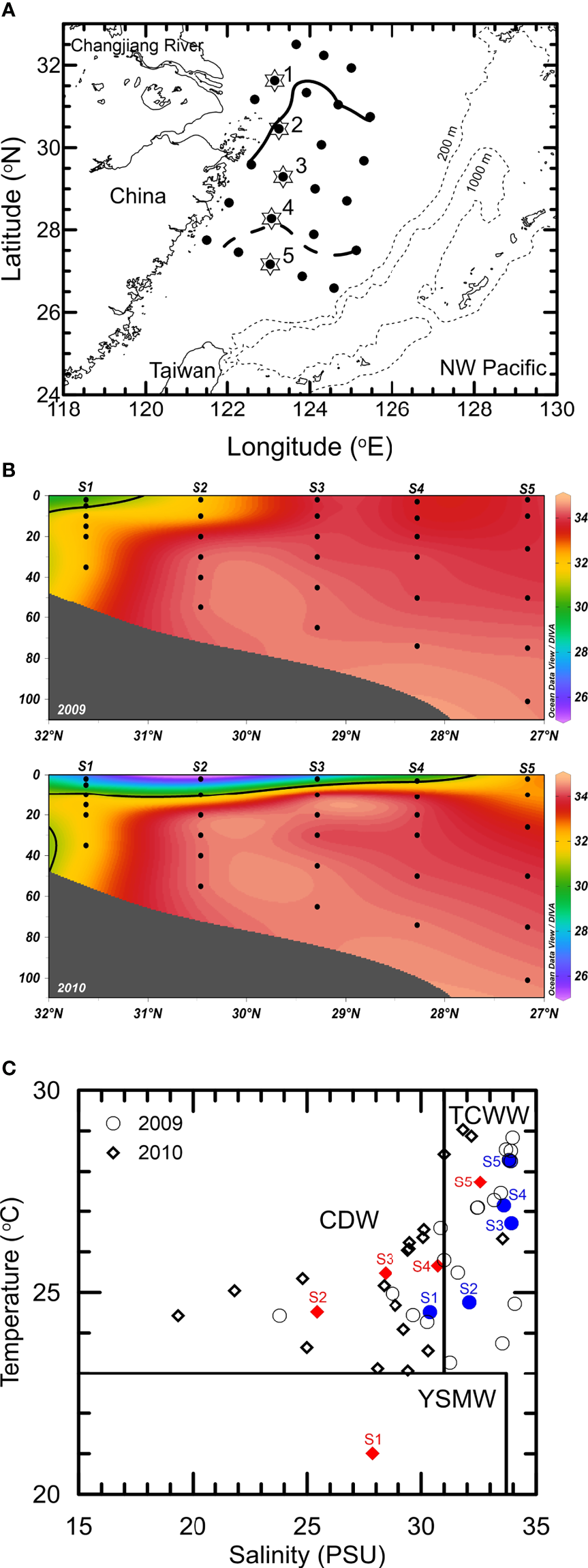 (A) Locations of observation stations in the East China Sea. The solid and dashed lines represent the isohaline of 31 in the summers of 2009 and 2010, respectively. A total of 24 stations were visited during the 2 cruises. The phylogenetic analysis of 18S rRNA genes was performed based on the surface samples of Stations 1 to 5 denoted by star symbols. (B) Vertical distribution of salinity at Stations 1 to 5 in the summers of 2009 and 2010. The isohaline of 31 is indicated by the solid line. (C) Temperature-salinity diagram. Characterization of different water masses, including the Changjiang diluted water (CDW), the Taiwan strait current warm water (TCWW) and the Yellow Sea mixed water (YSMW), was in accordance with the definitions of Gong et al. (1996).