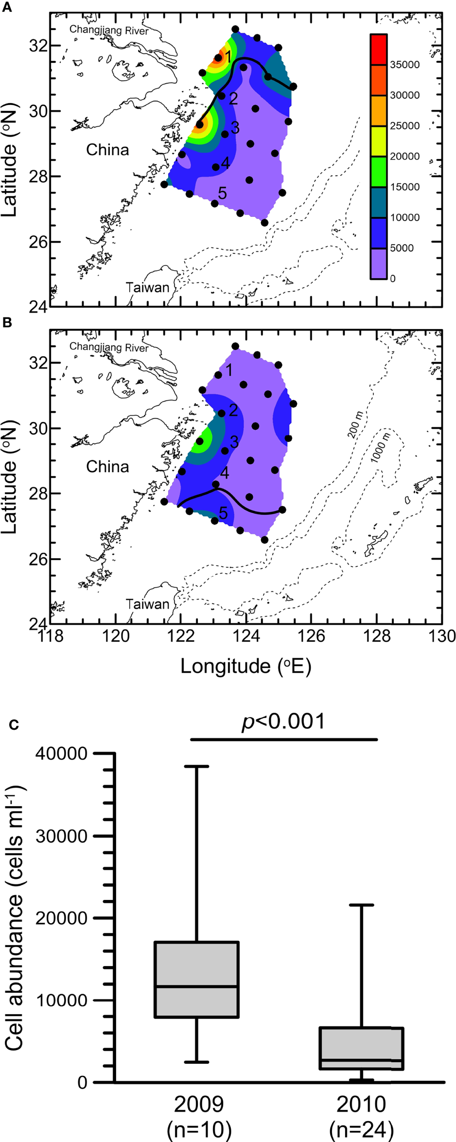 Distribution of photosynthetic picoeukaryotes (PPEs) (cells ml-1) at the surface on the East China Sea shelf in the summers of (A) 2009 and (B) 2010. The solid lines indicate the isohaline of 31. (C) Whisker plot of PPE abundance in the surface waters of the stations confined to the area within the isohaline of 31 (i.e., 10 stations in 2009 and 24 stations in 2010).