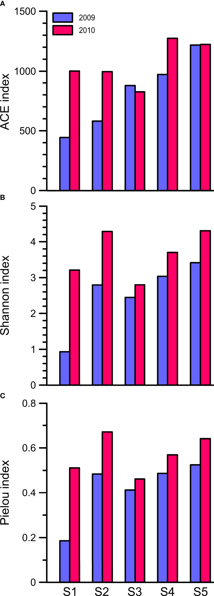 The (A) ACE, (B) Shannon diversity and (C) Pielou evenness indices of the community assemblages of picoeukaryotes, which were inferred from the OTU composition, at Stations 1 to 5 in the summers of 2009 and 2010.