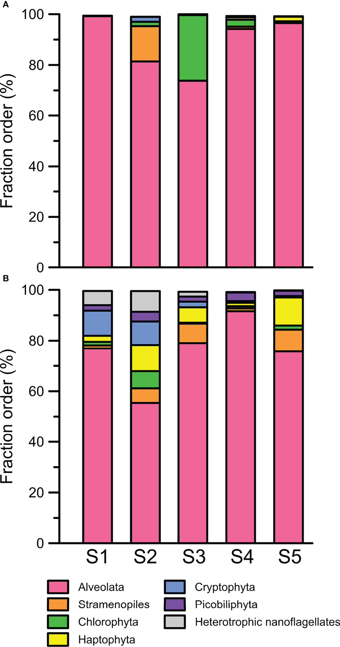 Community compositions of abundant picoeukaryotes indicated at the phylum level at Stations 1 to 5 in the summers of (A) 2009 and (B) 2010.