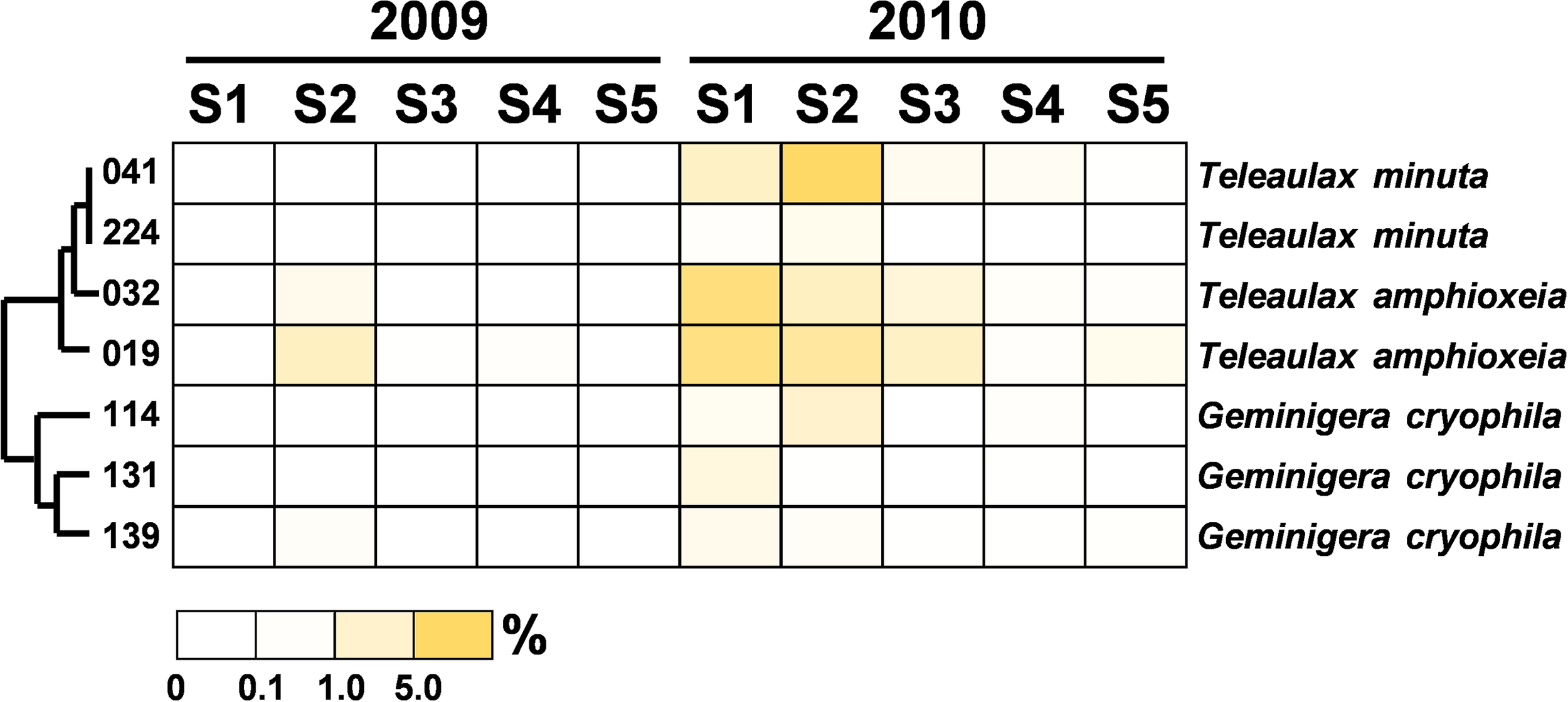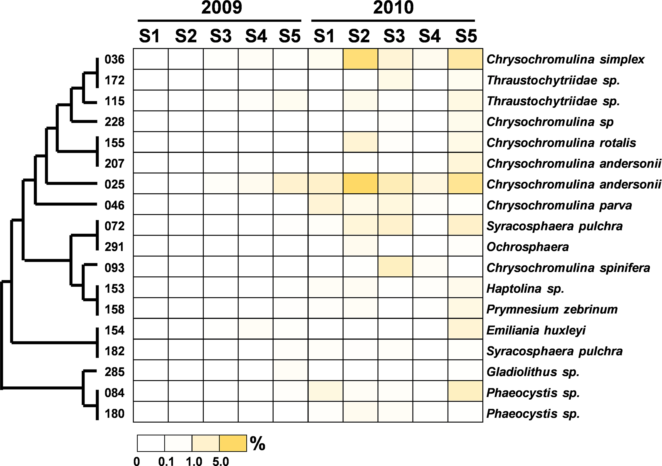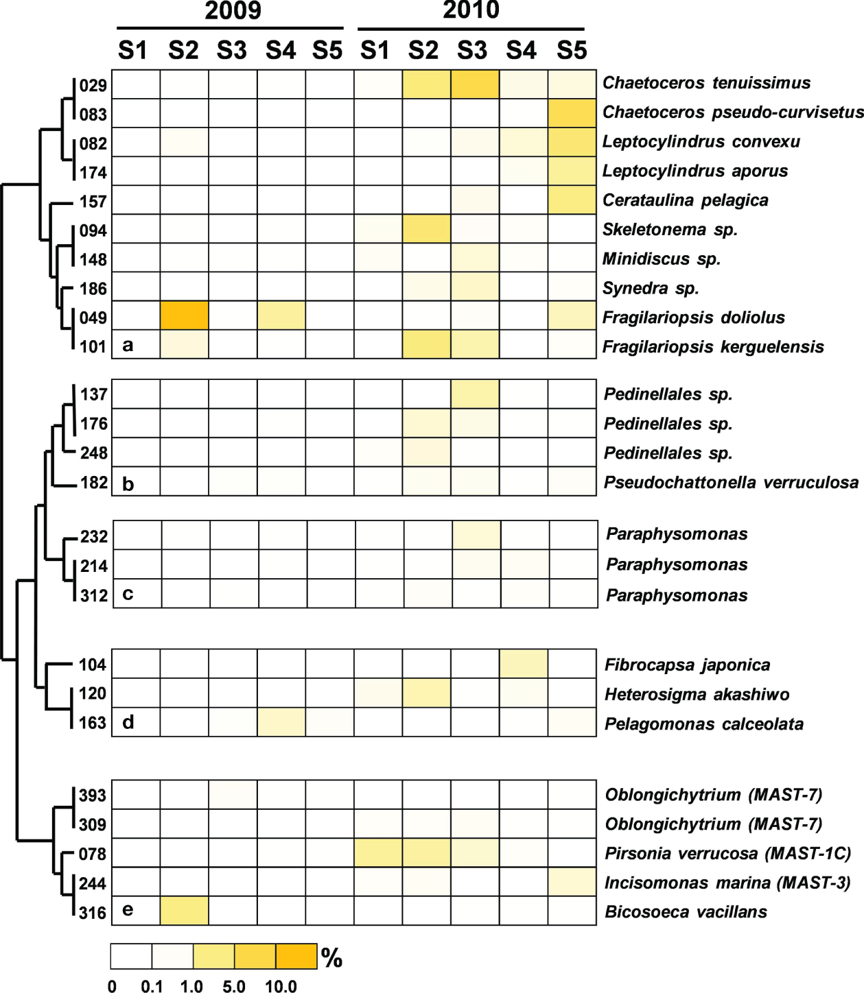 Heatmap representing the relative contribution of each abundant OTU of Haptophyta during the summers of 2009 and 2010. The relative contribution indicates the percentage of the number of 18S rRNA gene V4 sequences in each OTU. The phylogenetic tree in the left position was built using the maximum likelihood algorithm. The labels at the bottom position indicate the color codes of the different percentages.