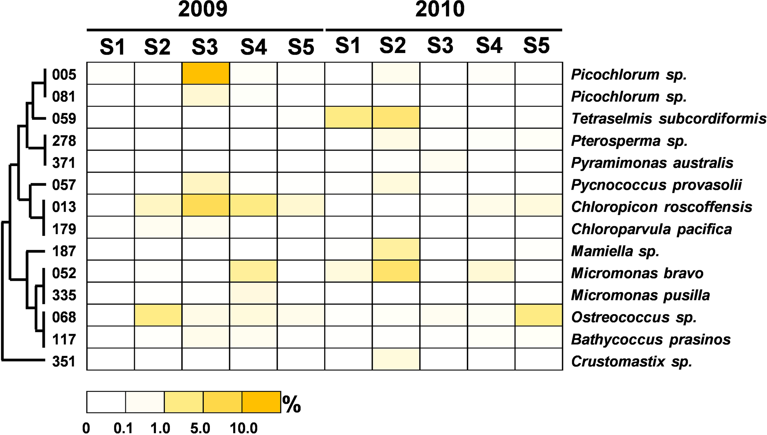 Heatmap representing the relative contribution of each abundant OTU of Chlorophyta during the summers of 2009 and 2010. The relative contribution indicates the percentage of the number of 18S rRNA gene V4 sequences in each OTU. The phylogenetic tree in the left position was built using the maximum likelihood algorithm. The labels at the bottom position indicate the color codes of the different percentages.
