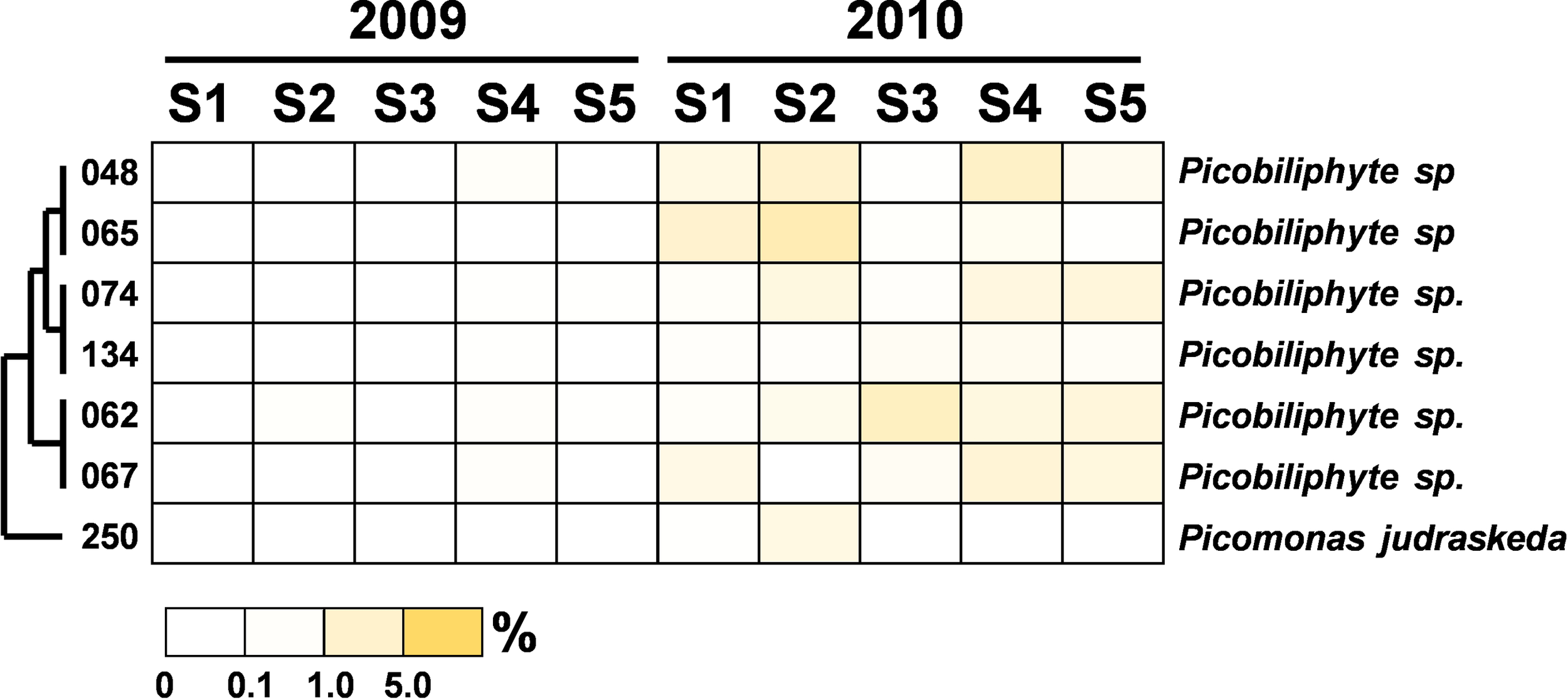 Heatmap representing the relative contribution of each abundant OTU of Picobiliphyta during the summers of 2009 and 2010. The relative contribution indicates the percentage of the number of 18S rRNA gene V4 sequences in each OTU. The phylogenetic tree in the left position was built using the maximum likelihood algorithm. The labels at the bottom position indicate the color codes of the different percentages.