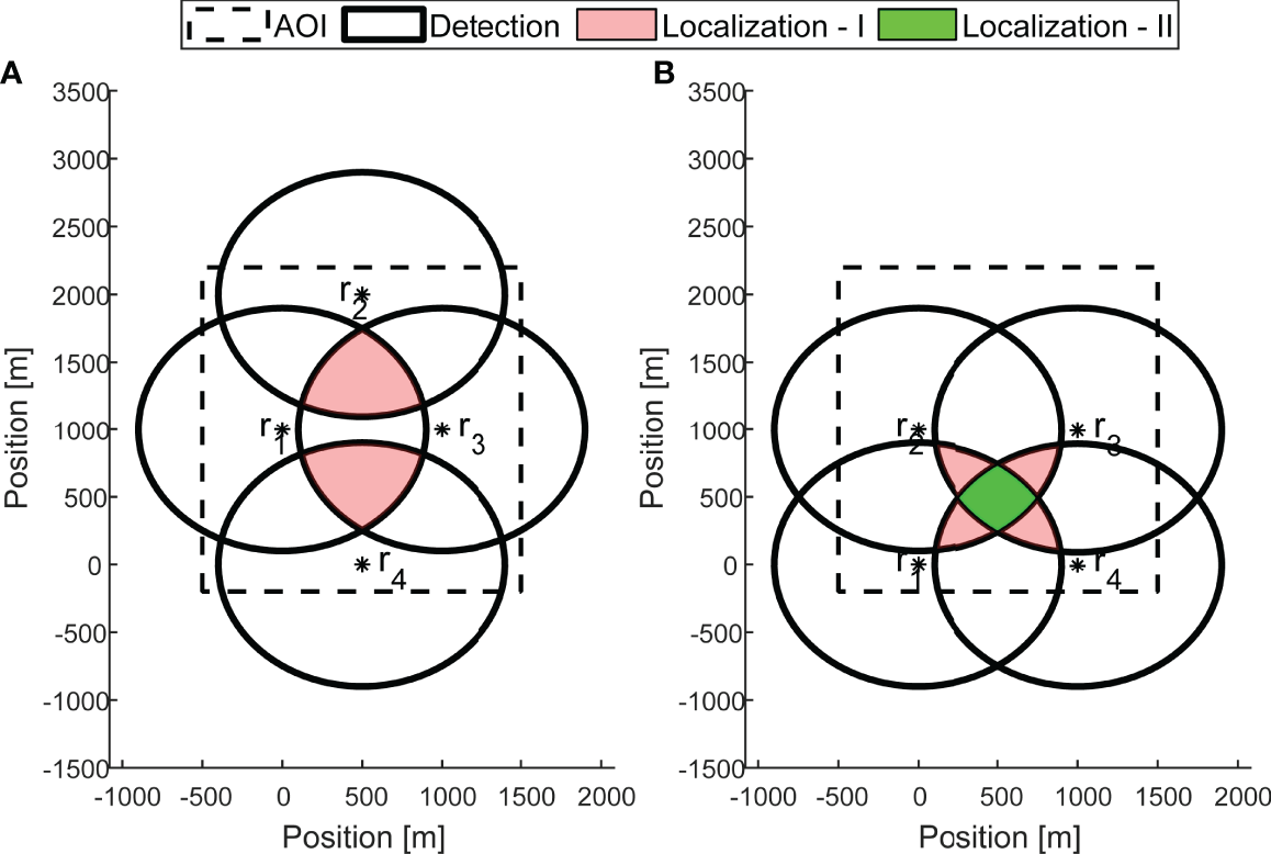An example showing the deployment of N = 4 receivers , with corresponding detection areas marked by black contour lines. For the case of β = 3, in deployment setup (A), although J = 5, there are two localization areas, L(λ1), L(λ2), marked by the light red shading. The two sets of at least 3 receivers are and . The coverage area, C, is the union of L( λ1 ), L( λ2 ) . In the deployment setup (B), the light red areas form “Localization area - I”, which merges localization areas L( λ1 ), L( λ2 ) , L( λ3 ), L( λ4 ) for which β = 3 detection areas overlap. The light green areas form “Localization area - II”, for which β = 4 detection areas overlap. For both deployment setups, the resulting localization area is non-convex.