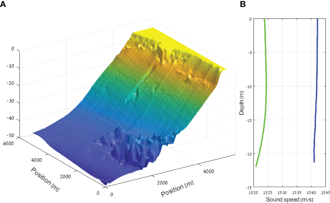 A moderate spatially diverse area: an area of 6000 × 6000 m2 shallow water area close to the “Orot Rabin” Power and Desalination Station in Hadera, Israel (32°28’N; 34°52’E; an area we also explored in our sea experiment. Within this area, the selected I area is a 2000 × 2000 m2 rectangle with a water depth ranging from 0 to 25 meters. The entire area was divided into a grid of 60 × 60, yielding a sample resolution of 100 m. Here, the receivers are anchored at a depth of 0.5 m above the seabed, and the mobile transmitter moves at a depth of 3 m. The bathymetry of this area is shown in Figure 2A.