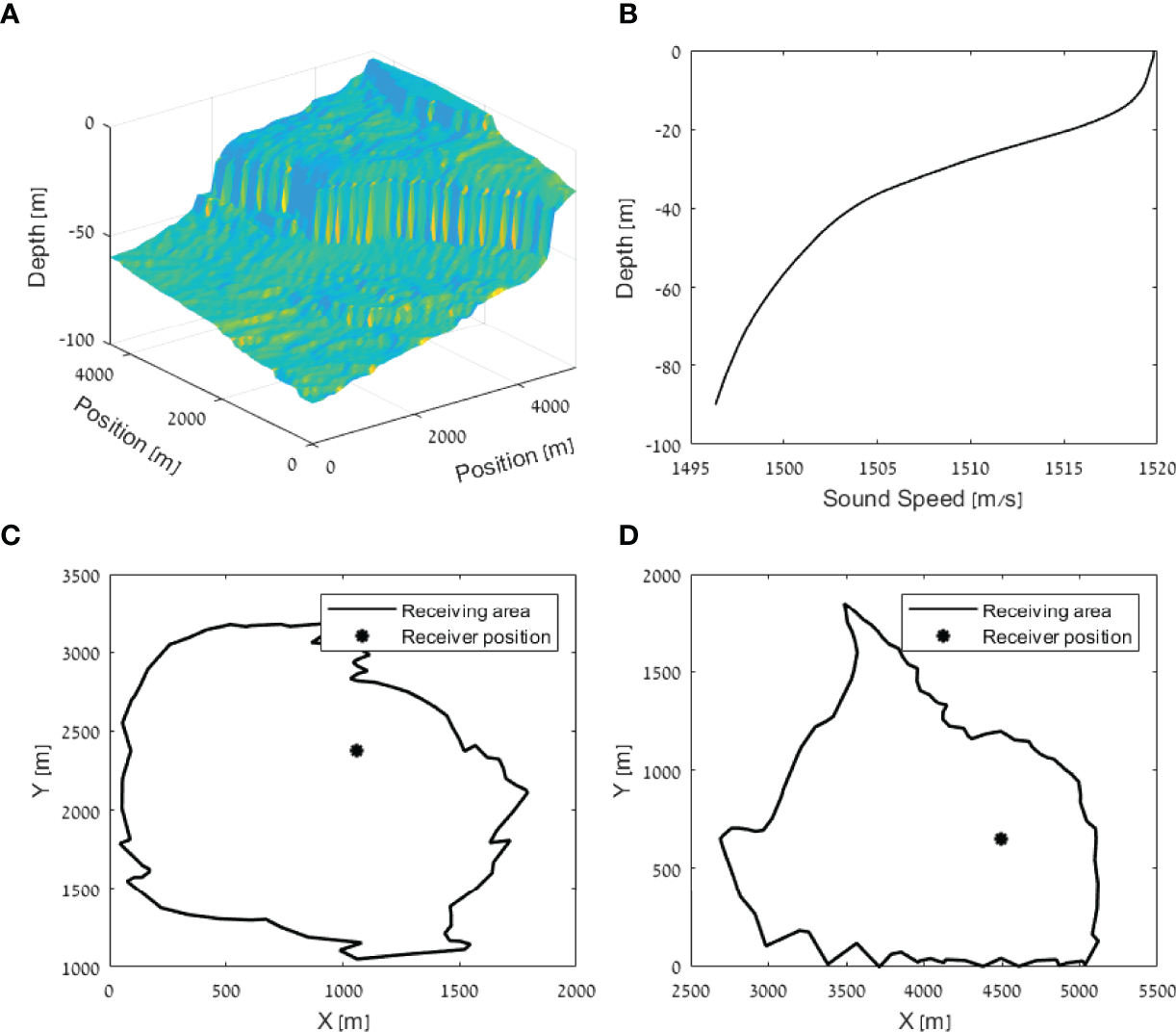 Environmental condition of shallow water close to San Diego Bay. (A) Bathymetry and (B) the sound velocity profile. The impact on the expected detection area of a single receiver is shown in (C) for a receiver positioned at (1000, 2400, -10) and in (D) for a receiver positioned at (4500, 750, -10).