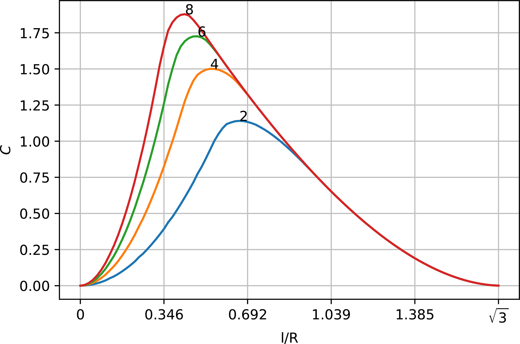 For the case at hand, R1 = R2 = R such that the distance between any two intersection points creating triangle ABC is . Thus,