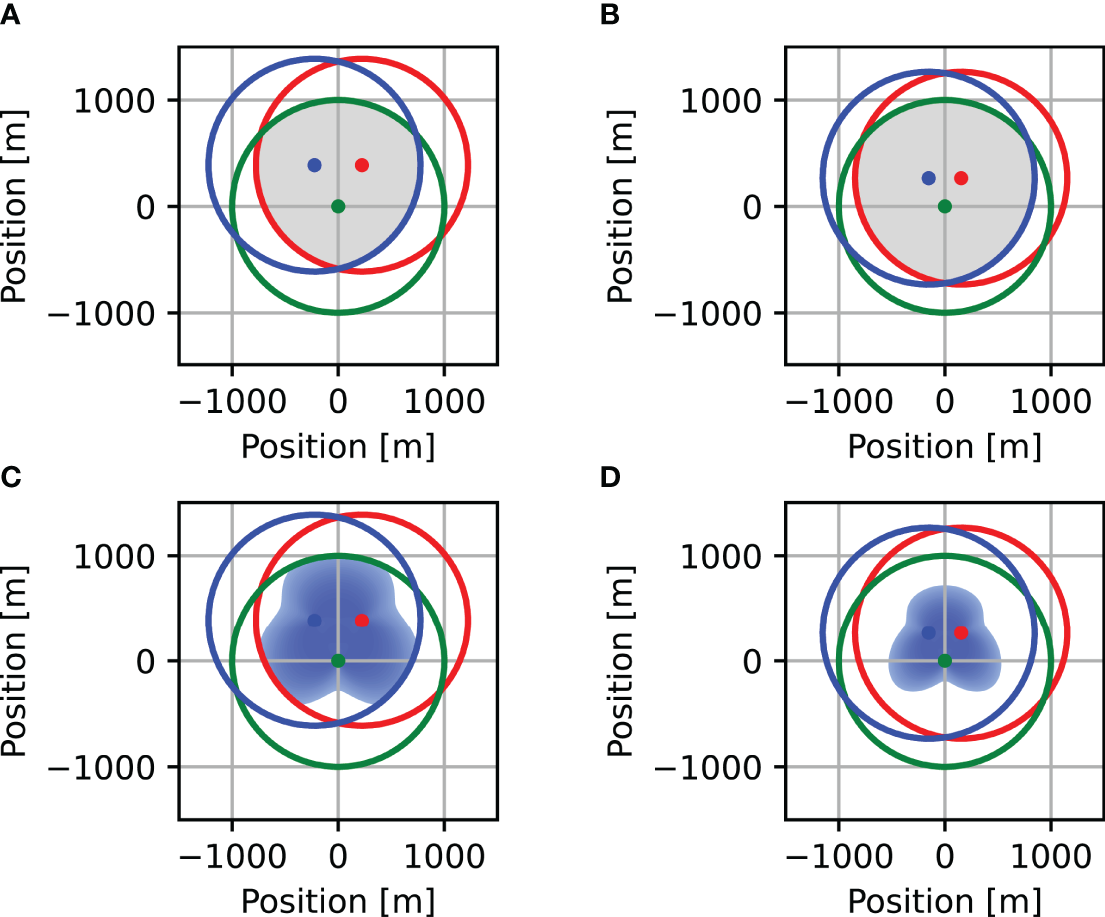 A closed-form solution of (15) for the simple case of three receivers deployed over a flat seabed with isotropic propagation loss is presented in the Appendix. We note that, in the general case, problem (15) is non-convex. This is because, as illustrated in Figure 1, even when the detection area of each receiver is convex (a circle or an ellipsoid) - and thus so is the localization area - the coverage area may be constructed from a number of non-continuous usable areas. Furthermore, as demonstrated in Figures 1A, B, even for a convex localization area, the usable area itself may be non-convex. Hence, (15) is a constrained non-convex optimization problem, which can be solved by procedures such as branch and bound (B&B) (Clausen, 1999) with a polynomial complexity on average (Zhang and Korf, 1992; Shabi et al., 2017), or by randomized approaches such as simulated annealing (Blum et al., 2021). Here, we propose to use GA, which is suitable for complex deployments, i.e., a larger number of receivers and diversified bathymetric and bathythermal conditions. We chose GA since it is suitable for overcoming local minima in problems involving a non-convex objective function (Mnasri et al., 2015). The fitness function is multi-objective, seeking to maximize the coverage area inside I and to minimize a penalty function for coverage outside I.