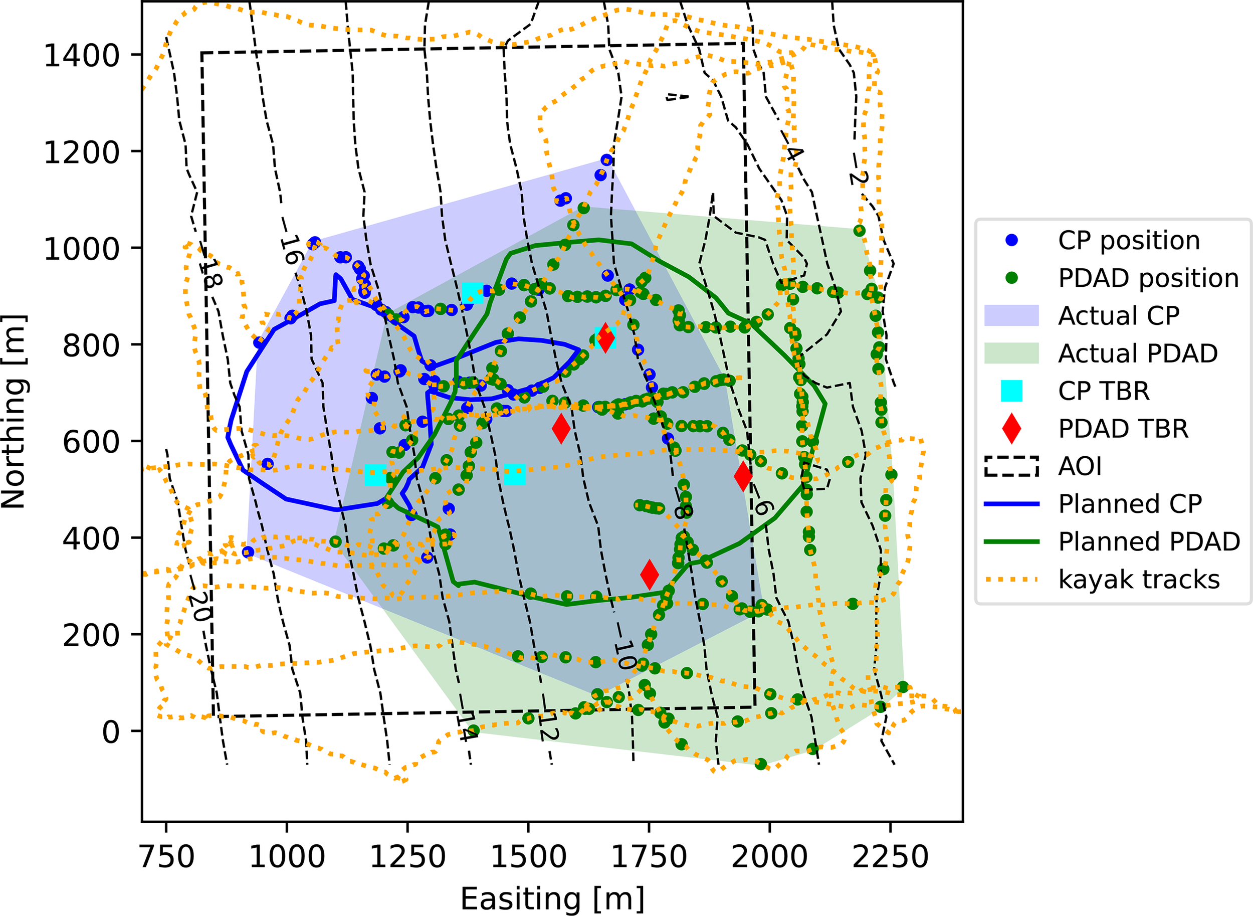 The experiment lasted for 240 min. During that time, each tag emitted a signal in a fixed interval every 30 to 45 sec, for a total of 2,730 emissions. Out of these, 406 emissions were detected by at least one receiver and 280 emissions were detected by at least three receivers of the CP or PDAD clusters. In order to ensure that the four kayaks cover the complete area of interest, their route, provided in Figure 8, was planned to reach beyond the anticipated detection range of the tags. As a result, we report low tag detection rate. For each detected emission, the receivers measured the ToA by their internal clock. The receivers were time-synchronized prior and after the experiment. This involved both synching the receivers’ clock to a reference clock by attaching a specific acoustic tag to one of the receivers, and using its emissions to time-synchronize the others (see details in (Alexandri et al., 2018)). Tag emissions were sorted and aggregated to the CP and PDAD clusters. If received by either three or four receivers, the emissions were considered to be inside the usable area that allows localization. To comment on the receiving conditions we also recorded the ambient noise level, as measured by each receiver.