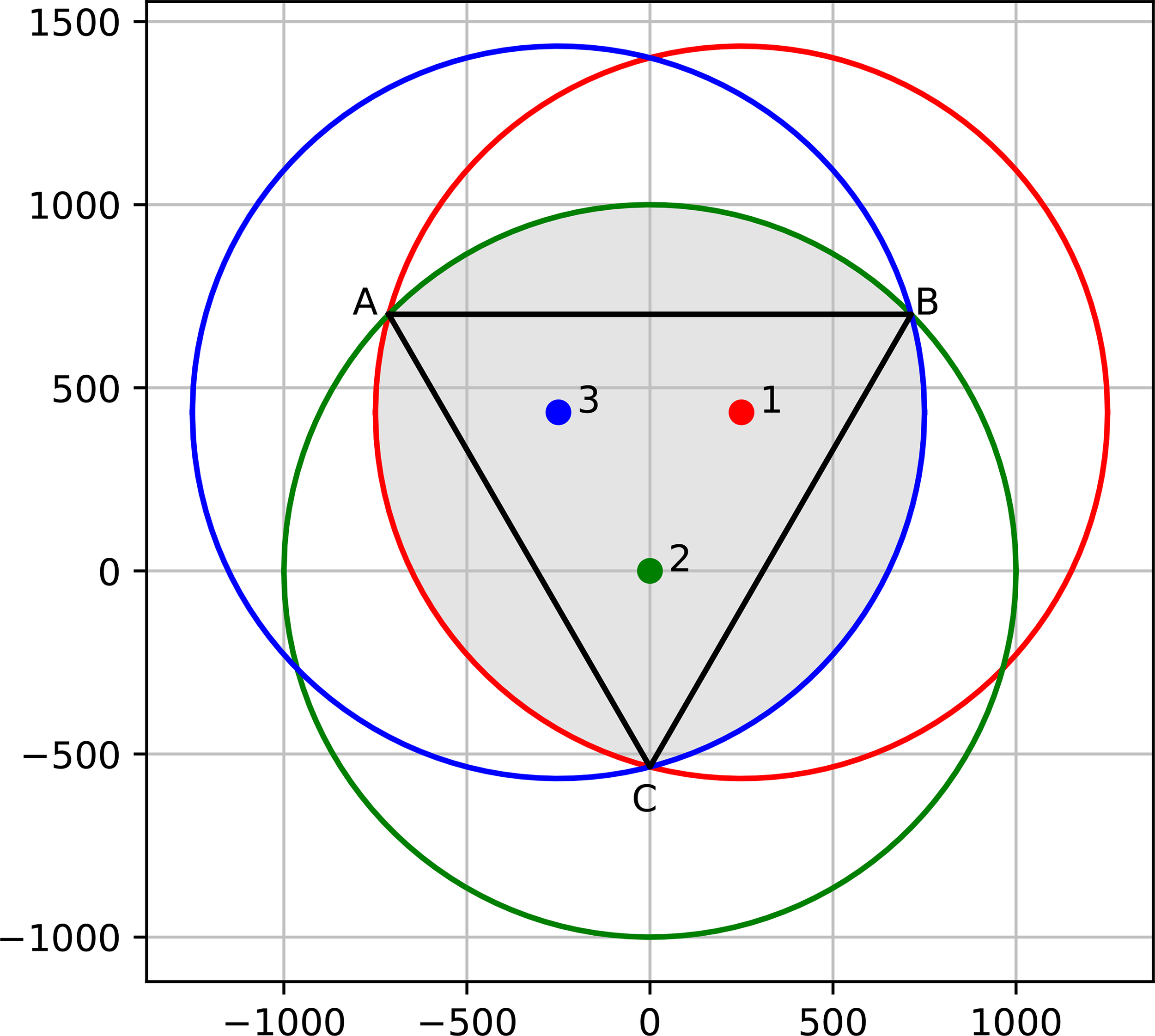 An interesting case to explore is the deployment of 3 receivers on a flat seabed with isotropic propagation loss and with no constraint on the area of interest. The question explored is: What is the best receivers setup to attain the maximal covered area C. The expected answer is an equilateral triangle setup (Fewell, 2006; Shiu et al., 2010). Yet, the proof is not trivial.