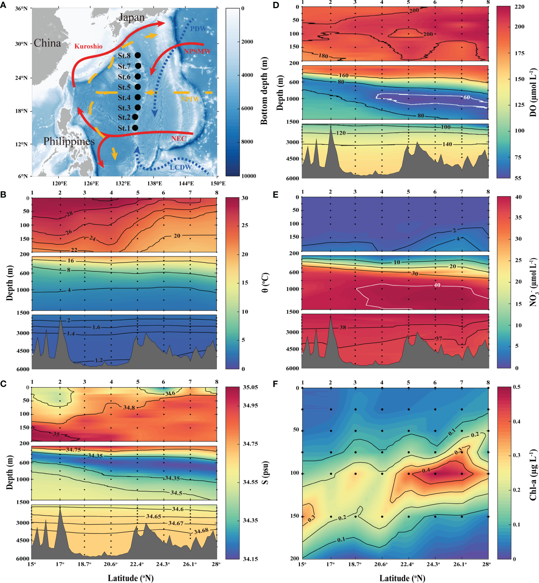 (A) Study area and station locations in the Subtropical Western North Pacific Ocean (STWNPO). Different colors (white–blue gradient) represent the bathymetry information. Schematic arrows represent flowing major currents and water masses in compliance with the surface (red and solid), intermediate (yellow and dashed), and deep (blue and dotted) layers. The vertical profiling of (B) potential temperature (θ), (C) salinity (S), (D) dissolved oxygen (DO), (E) nitrate (), and (F) chlorophyll-a (Chl-a) along the latitudinal transects in the STWNPO. The black dots indicate sampling locations/depths, and the black/white solid lines represent the contour lines of each parameter. The numbers (1–8) at the top of (B–F) are the station numbers. This figure is also available with a gray color version in Supplementary Materials.