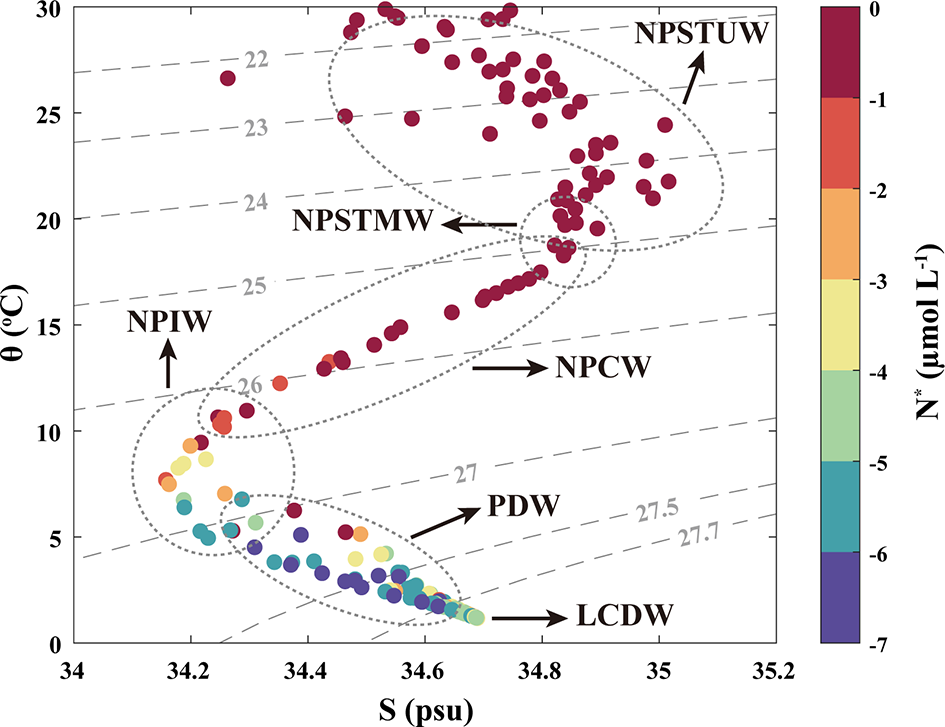 The potential temperature (θ) and salinity (S) distributions are labeled with N*. The dotted grey lines represent the extent of water masses, and the dashed lines represent the potential density anomaly (σθ–1000 kg m−3) of the STWNPO. Acronyms: North Pacific subtropical underwater (NPSTUW), North Pacific subtropical mode water (NPSTMW), North Pacific central water (NPCW), North Pacific intermediate water (NPIW), Pacific deep water (PDW), and lower circumpolar deep water (LCDW). This figure is also available with a gray color version in Supplementary Materials.