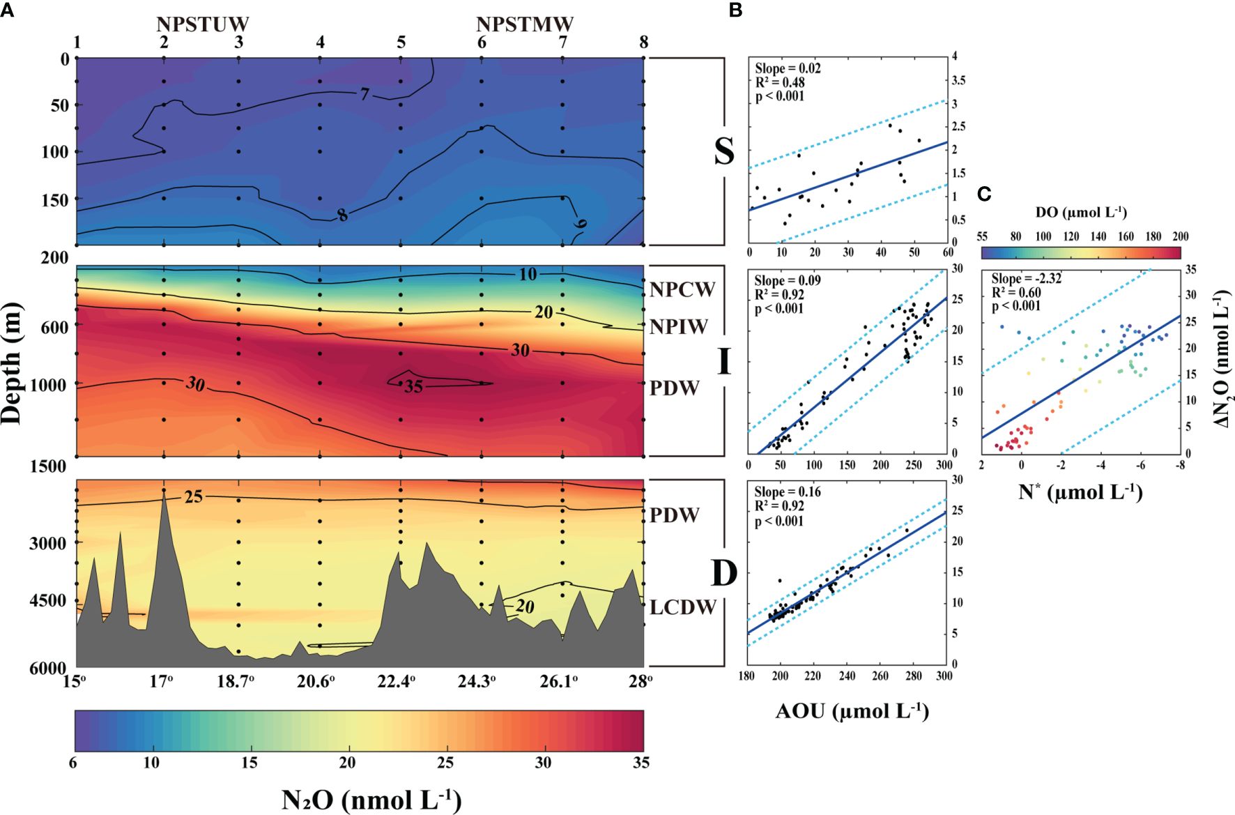 (A) Vertical profiling of N2O concentrations at the surface (0–200 m), intermediate (200–1500 m), and deep (1500–5774 m) layers of the STWNPO during this investigation. The black solid lines represent the contour lines and the abbreviations of water masses indicate the distribution of water masses. The top and bottom of the x-axis represent the station numbers and latitudes, respectively. (B) Correlations of ΔN2O with AOU and (C) N* at each layer. The blue lines and cyan dotted lines represent the model I linear regression and 95% prediction interval, respectively. The correlations of ΔN2O with N* at the intermediate layer are labeled with DO. This figure is also available with a gray color version in Supplementary Materials.