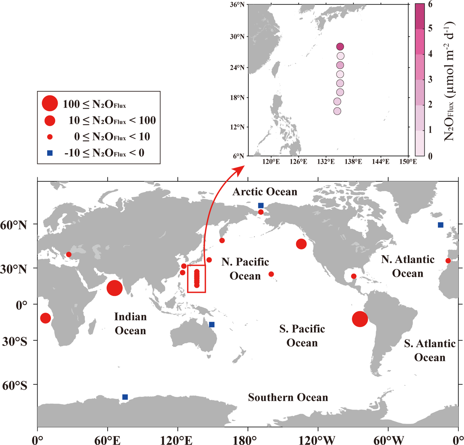 Spatial distribution of STWNPO surface N2O fluxes across the air–sea interface during the investigation (spring, 2020) and N2O fluxes from various regions. The points encompassed by the red box represent the current study area. The N2O flux values of different regions are given in Supplementary Table S8.