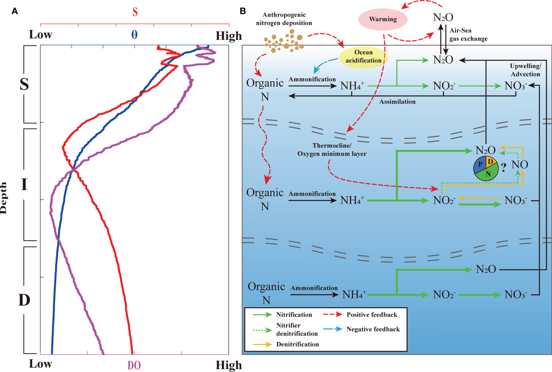 (A) Typical vertical profiling of potential temperature (θ), salinity (S), and oxygen (DO) concentration during this investigation from the STWNPO. (B) Schematic representation of N2O dynamics in this study. The green and yellow solid arrows represent nitrification and potential denitrification processes, respectively, the green dotted arrows represent the nitrifier denitrification process, and the thickness of the arrows depicts the proportion of the N2O production and associated mechanisms within each layer. The red dashed and blue dash-dotted lines represent positive and negative feedback for N2O dynamics, respectively. The blue, green, and yellow columns of the pie chart represent the approximate fractions of N2O produced through physical (P), nitrification (N), and denitrification (D) processes in the thermocline/oxygen minimum layer (OML), respectively. The estimated N2O production for each station is given in the Supplementary Figure S8.