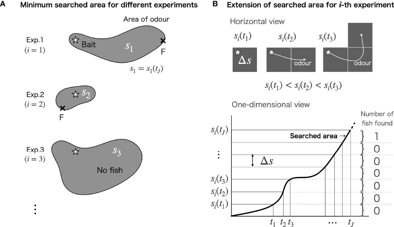 Based on these conditions, we begin by articulating the area extension rule in the ODORA method. The following mathematical treatment is visualized in Figure 1B. Let si(tj) be the searched area at a discretized elapsed time tj for the i-th experiment. In the duration until the searched area reaches the first fish at the time tj, the extension of the searched area in time satisfies the following relation,