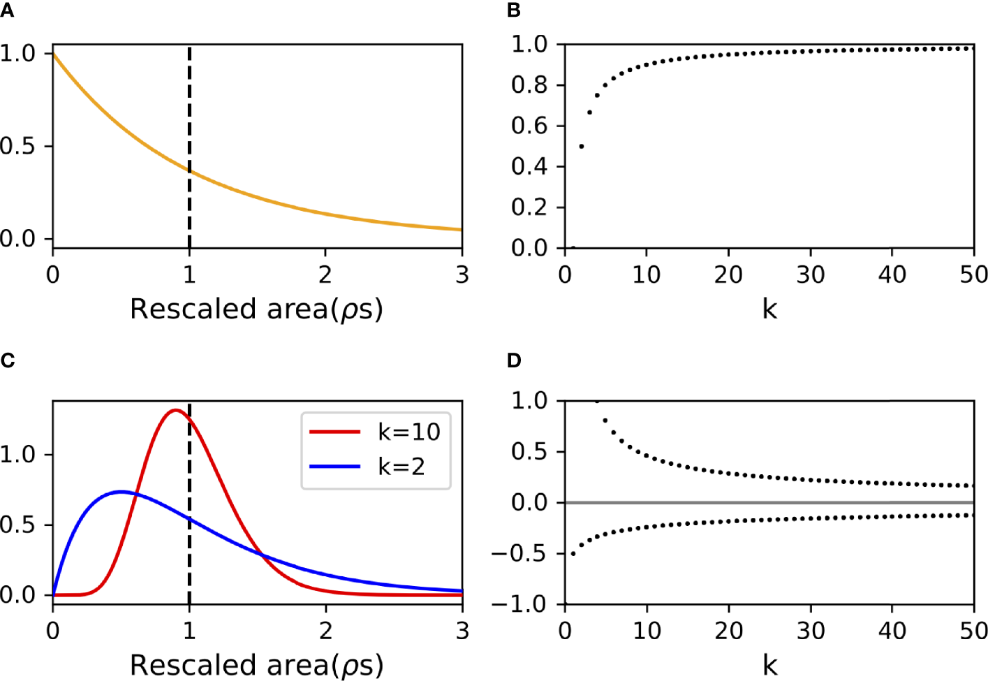 where denotes the modal value of the sample mean, . The difference between the expected value of the population density (ρ) and that identified by the mode is negligible for a large k (Figure 2B). This formula is null for k=1, since this case leads to the probability density function being an exponential distribution, which has no extremum.