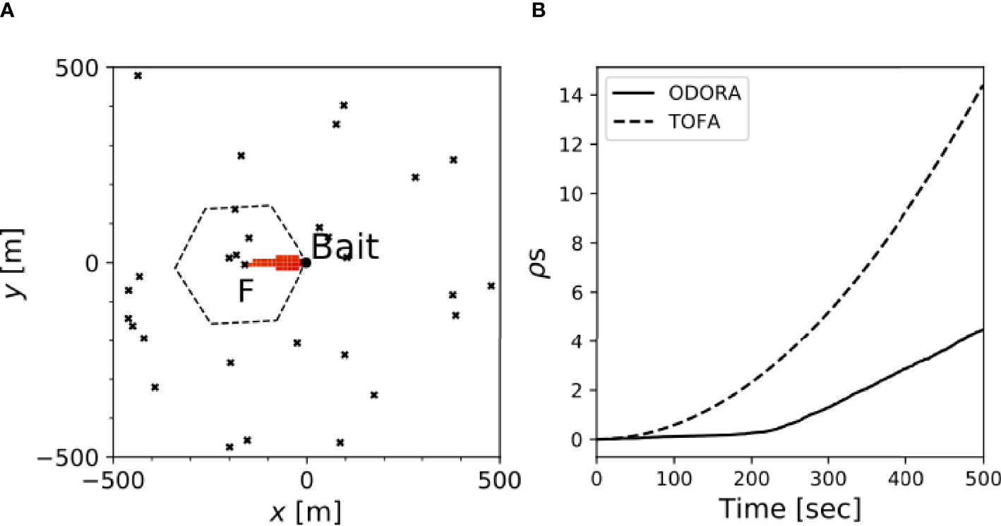 (A) Difference in the area enclosing the first fish, labeled F, between ODORA (in red) and TOFA methods (dashed hexagon). The fish positions in this panel show an example of the random dispersion pattern; (B) Time evolution of the area increment for each method.