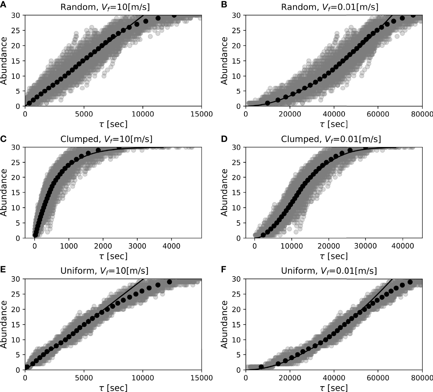 Time profiles of theoretical (black curve) and simulated (dots) fish abundance at bait for different swimming speeds (left: Vf=10 ms-1, right: Vf=0.01 ms-1) and different dispersion patterns (top:random; middle:clumped; bottom:uniform). The simulation is conducted under the same configuration as in the isotropic diffusion case in Figure 4, except that 200 experiments are conducted. The average of the arrivals for the individuals over the experiments is shown in black dots. The diffusion coefficient is set to 100 m2s-1 in reference to the order of isopycnal eddy diffusivity (Tulloch et al., 2014).