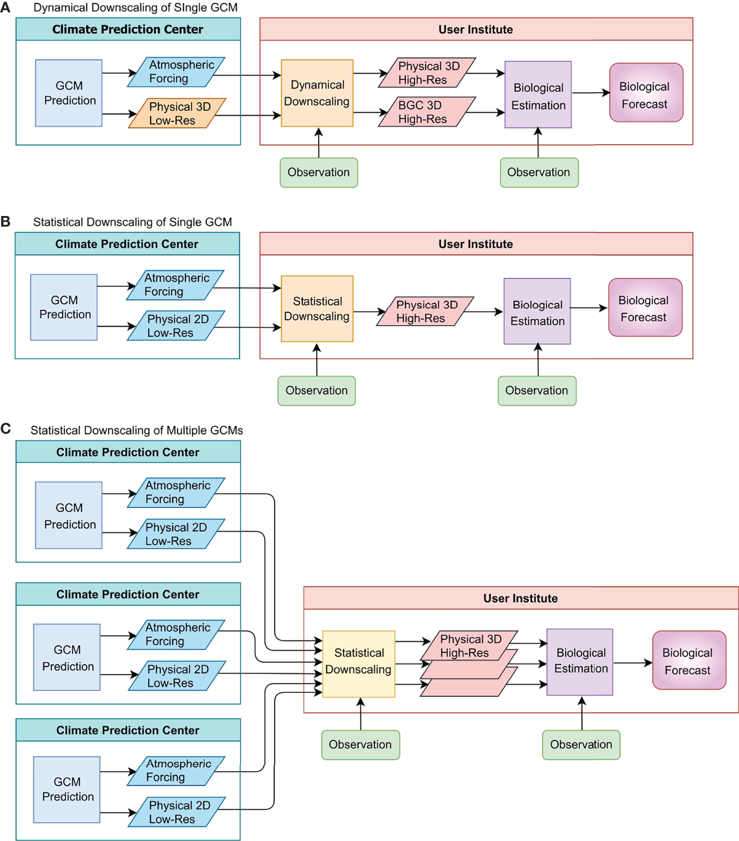 Typical workflows of biological forecasts based on physical GCM predictions. The squares indicate systems that produce predictions, downscaling or biological estimation, whereas the parallelograms indicate the outputs from the systems. Panel (A) and panel (B) indicate the workflows with dynamical and statistical downscalings, respectively, using outputs of a single GCM prediction, and panel (C) indicates the workflow using outputs of multiple GCMs with statistical downscaling. The stacked parallelograms in the middle of panel (C) indicate downscaling of different GCM predictions. “BGC” in the figure indicates information about biogeochemistry and lower-trophic level biology. Downscaling can be skipped if GCM predictions are of adequate resolution and acceptable bias. The physical prediction is assumed to be conducted by GCMs, but it can be made by ESMs, which also include BGC.