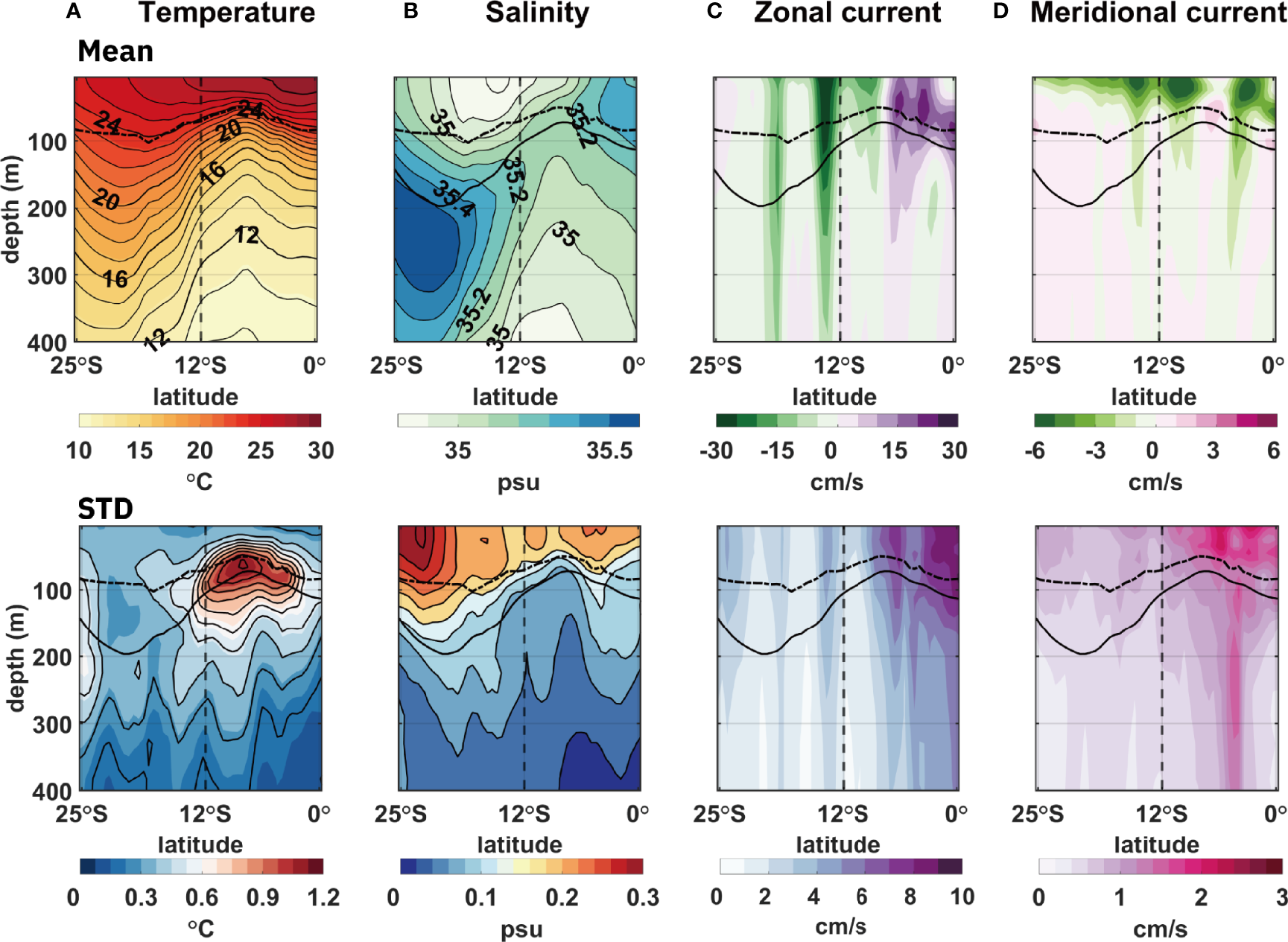 Figure 2 illustrates the zonally averaged mean and standard deviation of the temperature, salinity, and zonal and meridional current velocity in the upper 400 m of the SWTIO. The mean thermocline depth is shallower in the northern region (northern: ~66 m, southern: ~87 m), which is associated with the SCTR, and the peak of the SCTR (shallowest thermocline depth) is observed at approximately 8°S (Figure 2A). The mean D20 is shallower (~91 m) and closer to the thermocline depth in the northern region, but the mean D20 is substantially deeper (~163 m) in the southern region. In the northern region, the near-surface (< D20) is more saline, but the deeper layer (> D20) is more saline in the southern region (Figure 2B). The fresh near-surface water in the southern region is from the Indonesian Throughflow in the equatorial eastern Indian Ocean (Gordon et al., 1997; Makarim et al., 2019). The mean zonal currents show meridionally opposing directions, reflecting the southeastward-flowing South Equatorial Counter Current (SECC) to the north of the SCTR (north of approximately 8°S) and the southwestward-flowing South Equatorial Current (SEC) to the south of the SCTR (Figures 2C, D).