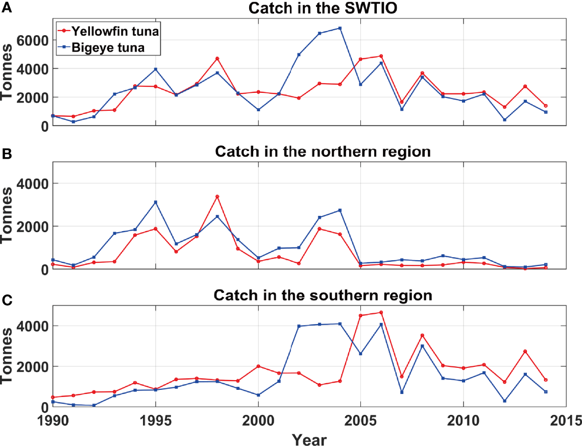(A) The annual catch amounts of yellowfin tuna and bigeye tuna during 1990–2014 in the four exclusive economic zones (EEZs) of the entire SWTIO. (B) The same as (A), but only for the northern region of the SWTIO (the Republic of Seychelles). (C) The same as (B), but only for the southern region of the SWTIO (the Republic of Mauritius, Tromelin Island, and Reunion Island).