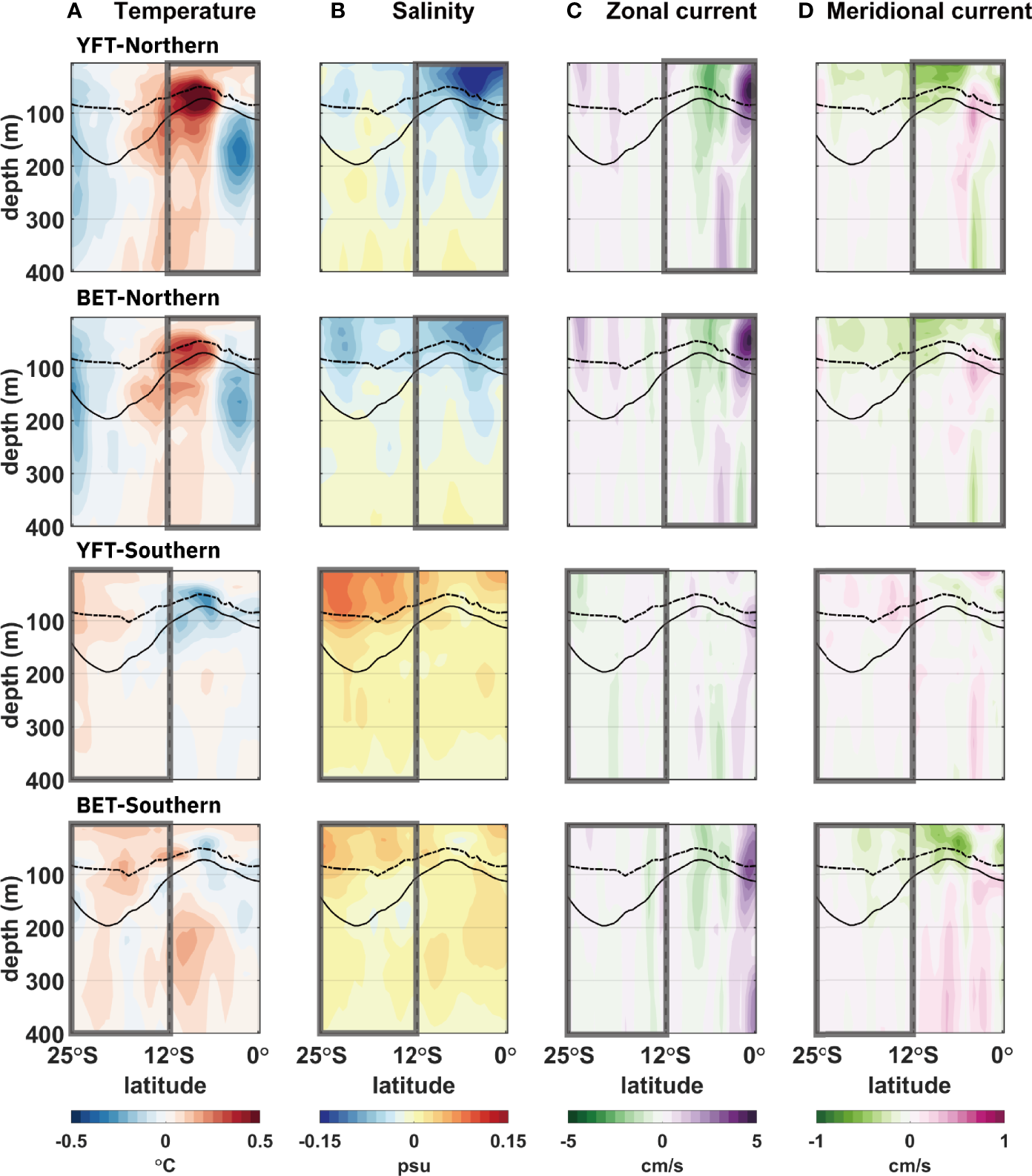 The salinity conditions, during the increase of the YFT and the BET catches in the northern region, exhibit similar anomalies with the near-surface (< D20) freshening in the northern region (top two rows in Figure 4B). Those freshening in the northern region is consistent with an increase of precipitation in this region (top row in Supplementary Figure 4). On the other hand, the positive salinity anomalies and the decrease of precipitation are detected in the southern region during the increase of the YFT and the BET catches in the southern region (bottom two rows in Figure 4B and middle row in Supplementary Figure 4). The negative anomalies in the north and the positive anomalies in the south contribute to the similar near-surface salinity ranges of 34.8–35.2 psu, which is within the favorable salinity range for an increase of the YFT and the BET catches reported in the Indian Ocean (Song et al., 2008; Song et al., 2009).