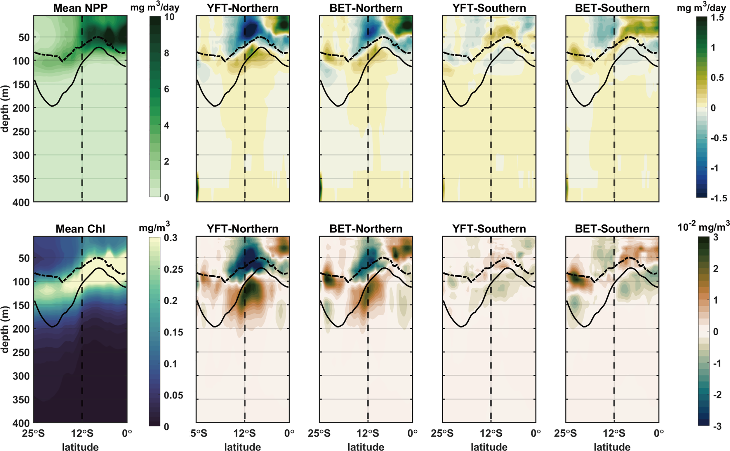 Meridional distribution of the mean (first column) and the regressed and reconstructed anomalies of the net primary production (NPP; upper row) and chlorophyll concentration (Chl; lower row) during 1993–2014. Target time series are the annual catch amounts of yellowfin tuna (YFT) and bigeye tuna (BET) in the northern (second and third columns) and southern (fourth and last columns) regions of the SWTIO. The anomalies are presented after zonal average from 54°E to 60°E. The thick dashed/dotted lines and solid lines indicate the mean thermocline depth and D20, respectively.