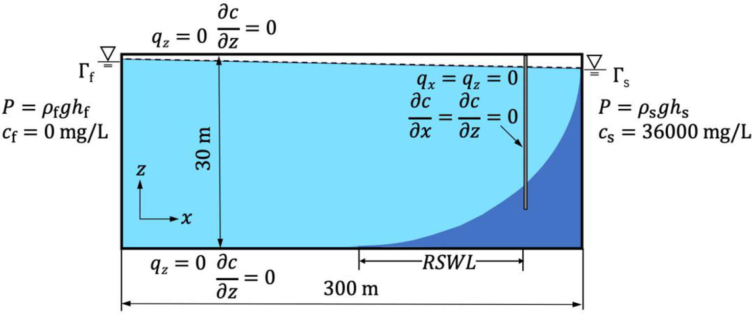 Figure 5 delineates the model setup (Zheng et al., 2021), in which q is the fluid flow and P is pressure. The model domain is 300 m (length) × 30 m (height). Neumann no-flow boundary conditions for both mass and fluid transport are assigned on the upper and bottom of the domain. Dirichlet constant water level boundaries are set to both the left (29.7 m) and the right sides (28.8 m) of the domain. Dirichlet mass boundaries are assigned with a constant salt concentration of cs= 36000 mg/L and cf= 0 mg/L on the seaward and the inland boundaries, respectively. A 0.5-m thick cut-off wall is installed at a prescribed location along the x -axis of the domain. Before the simulation, no saltwater existed in the domain.