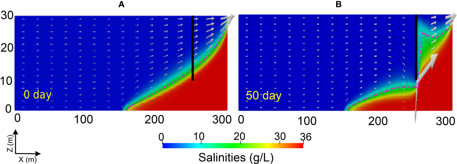 Transient distributions of groundwater flow and saltwater wedge after the construction of a 25 m-depth cut-off wall at 50 m from the seaward boundary at 0 day (A) and 50 days (B). The vertical black lines indicate the installed cut-off wall, the red dotted lines represent the isolines of 50% salinity of the saltwater, the white arrows represent the magnitude and direction of groundwater flows.