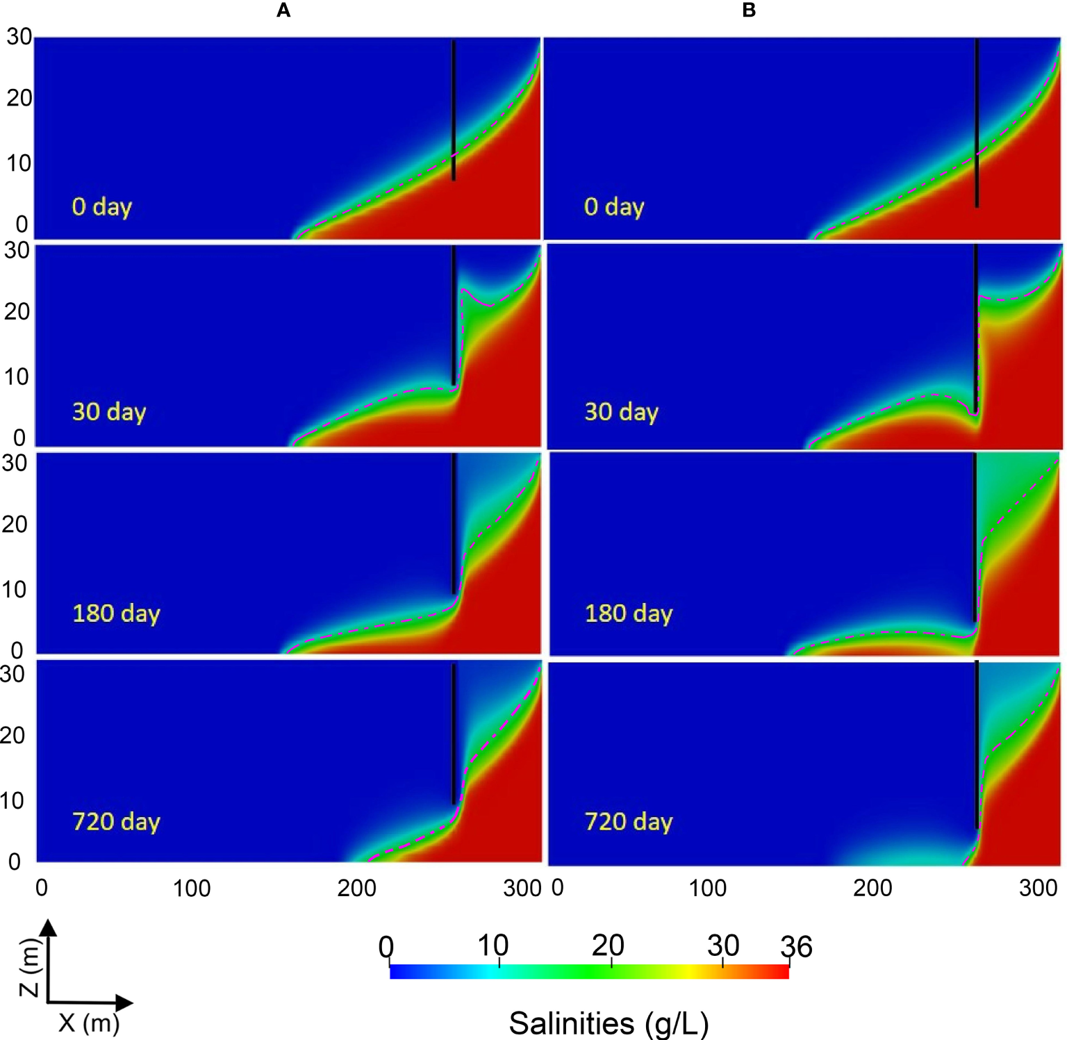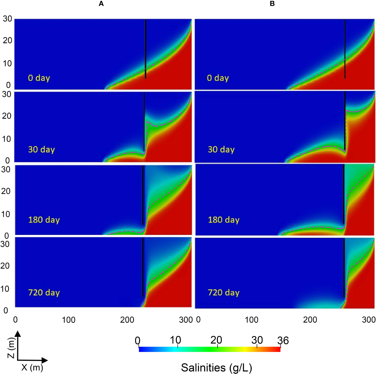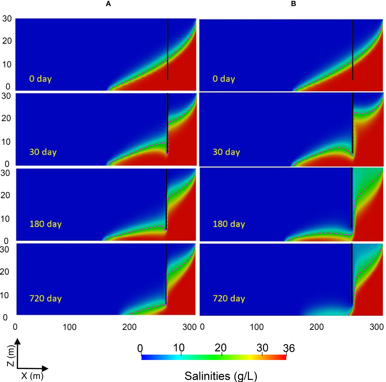 Transient distributions of residual saltwater after the construction of a 25 m-depth cut-off wall with hydraulic conductivity of 4×10-6 m/s (A) and 10-7 m/s (B) at 50 m from the sea boundary at 0, 30, 180 and 720 day. The vertical black lines represent the cut-off walls, and the red dotted lines are the isolines of 50% salinity of the saltwater.