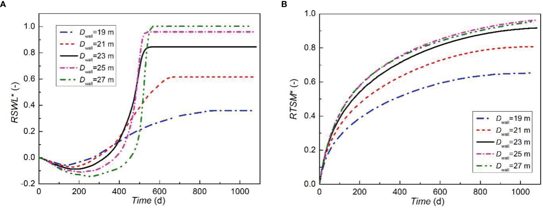 To further quantify the effects of wall depth on the removal of the residual saltwater, we calculate RSWL* and RTSM* for 19, 21, 23, 25, and 27 m wall depth. The time-dependent variations of RSWL* and RTSM* are shown in Figure 8. RSWL0 is 100 m in all these cases. After the construction of the cut-off wall, the evolution of RSWL* can be divided into three stages: extension, retreat and equilibrium (Figure 8A). At the extension stage, RSWL* reduces to the lowest value, i.e., -0.04, -0.05, -0.07, -0.11 and -0.13 m on day 140, 165, 187, 213, and 235, corresponding to 19 m-, 21 m-, 23 m-, 25 m-, and 27 m-depth wall case, respectively. This interprets that the intruding saltwater advances to the maximum length. The advance of the saltwater wedge is because that the freshwater in the upstream aquifer is forced to flow through the opening below the wall, pushing the residual saltwater wedge behind the wall to advance landward. Generally, the time for the wedge to reach the maximum intrusion distance and the maximum intrusion length increase with the increment of the cut-off wall depth. At the retreat stage, a sharp increase of RSWL* within a short period is observed. During this stage, the residual saltwater wedge is flushed out of the wall downward in the landward aquifer. In the meantime, the thickness of the saltwater wedge is reduced because the residual saltwater has been removed first in the vertical direction. It should be noted that RSWL* only describes the change of saltwater toe along the 50% saltwater concentration isoline. At the equilibrium stage, the values of RSWL* remain at 1.00, 0.92, 0.78, 0.57 and 0.39 for 27 m-, 25 m-, 23 m-, 21 m-, and 19 m-depth wall, respectively, suggesting that in the upstream aquifer, RSWL decreases with the increase of the cut-off wall depth.
