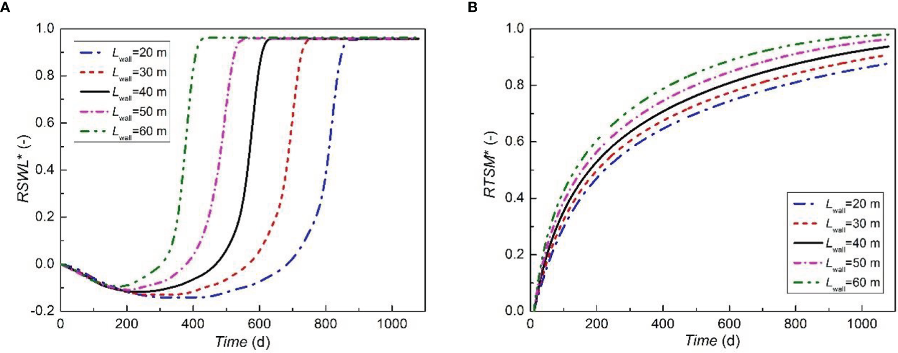 The change of RSWL*(A) and RTSM*(B) over time after the construction of a 25 m-depth cut-off wall at 20, 30, 40, 50, and 60 m from the sea boundary.