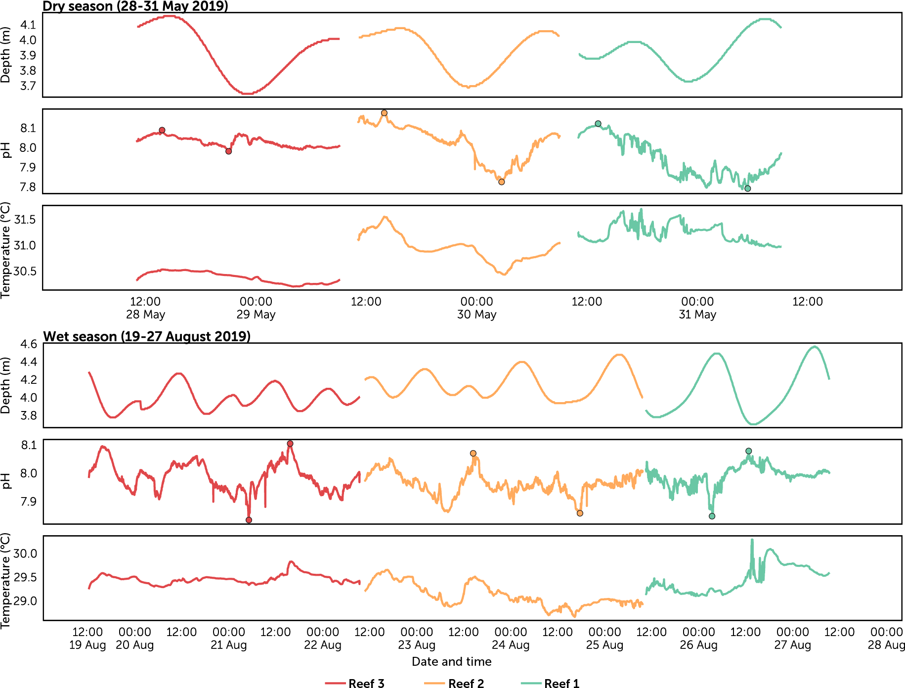 The diel range of pH (i.e., diel peak-to-trough amplitude) provided an estimate of the variability in pH at each reef site. The largest diel ranges were recorded during the dry season at Reef 2 (dry 0.35 vs. wet 0.18) and Reef 1 (dry 0.33 vs. wet 0.22), while the smallest range was at Reef 3 during the dry season (dry 0.09 vs. wet 0.22) (Table S4; Figure 5). The lowest pH (7.78) was recorded during nighttime at Reef 1 in the dry season, while the highest pH (8.18) was observed during daytime at Reef 2 also in the dry season. Diel fluctuations in pH and temperature coincided with each other, with the highest values occurring between midday and dusk, and the lowest values between midnight and dawn (Figure 5). Diel fluctuation and amplitudes of the other carbonate chemistry parameters (TA, DIC, pCO2, and ΩArag) were consistent with pH (Table S5; Figure S1). When pH was higher during the day, high ΩArag and low TA, DIC and pCO2 were observed, and at night when pH was depressed, low ΩArag, high TA, DIC and pCO2 were observed.