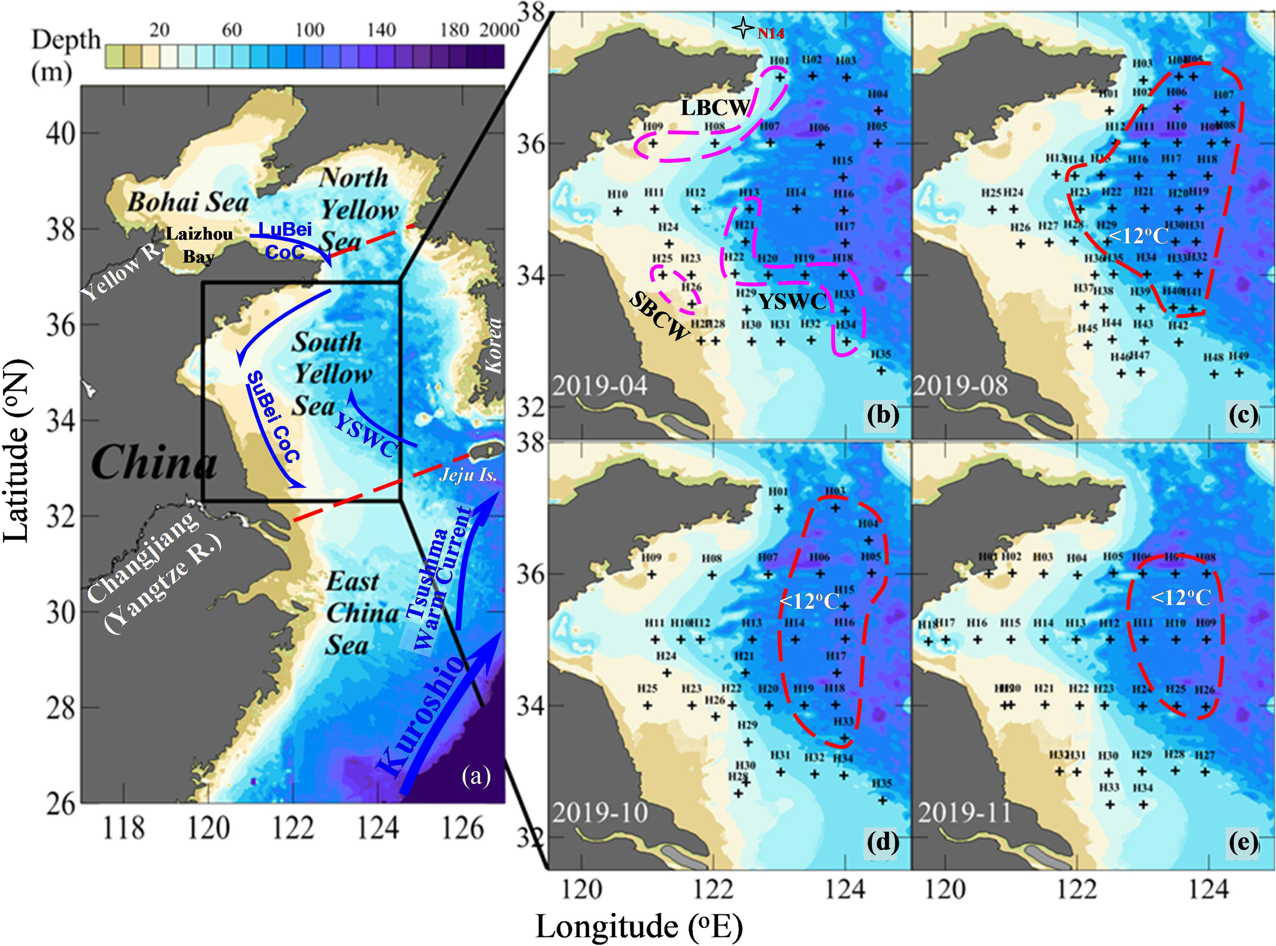 Cruise-based distributions of seawater temperature in the SYS showed a remarkable seasonal variation (Figures 3a–h). From spring to summer, the sea surface temperature rose from 9.6–12.3°C in April to 22.0–28.8°C in August, while it dropped to 20.0–23.0°C in October and to 14.3–19.9°C in November. In contrast, the bottom-water temperature increased moderately from 10.1 ± 1.1°C in April to 16.6 ± 5.4°C in November. The vertical gradient of temperature in summer and mid-autumn brought about the development of a seasonal thermocline (Figure S1).