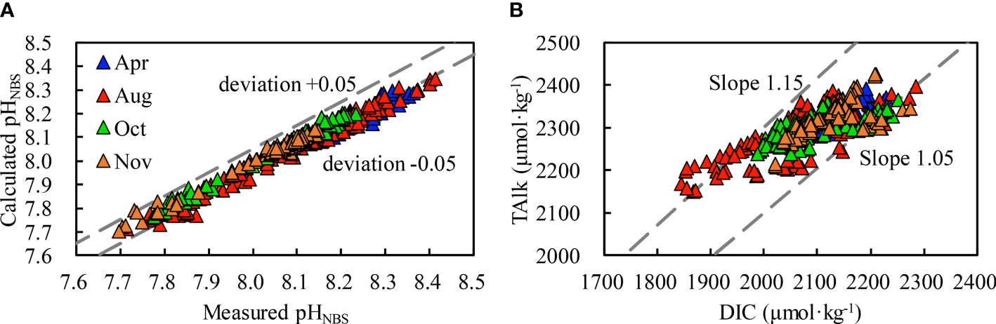 Evaluation of data quality for seasonal mapping cruises in 2019, including the relationship between calculated pHNBS and measured pHNBS(A) and between TAlk and DIC (B). The two dashed lines in panel (A) show a deviation of ± 0.05, and the two dashed lines in panel (B) show TAlk–DIC ratios of 1.05 and 1.15, respectively.