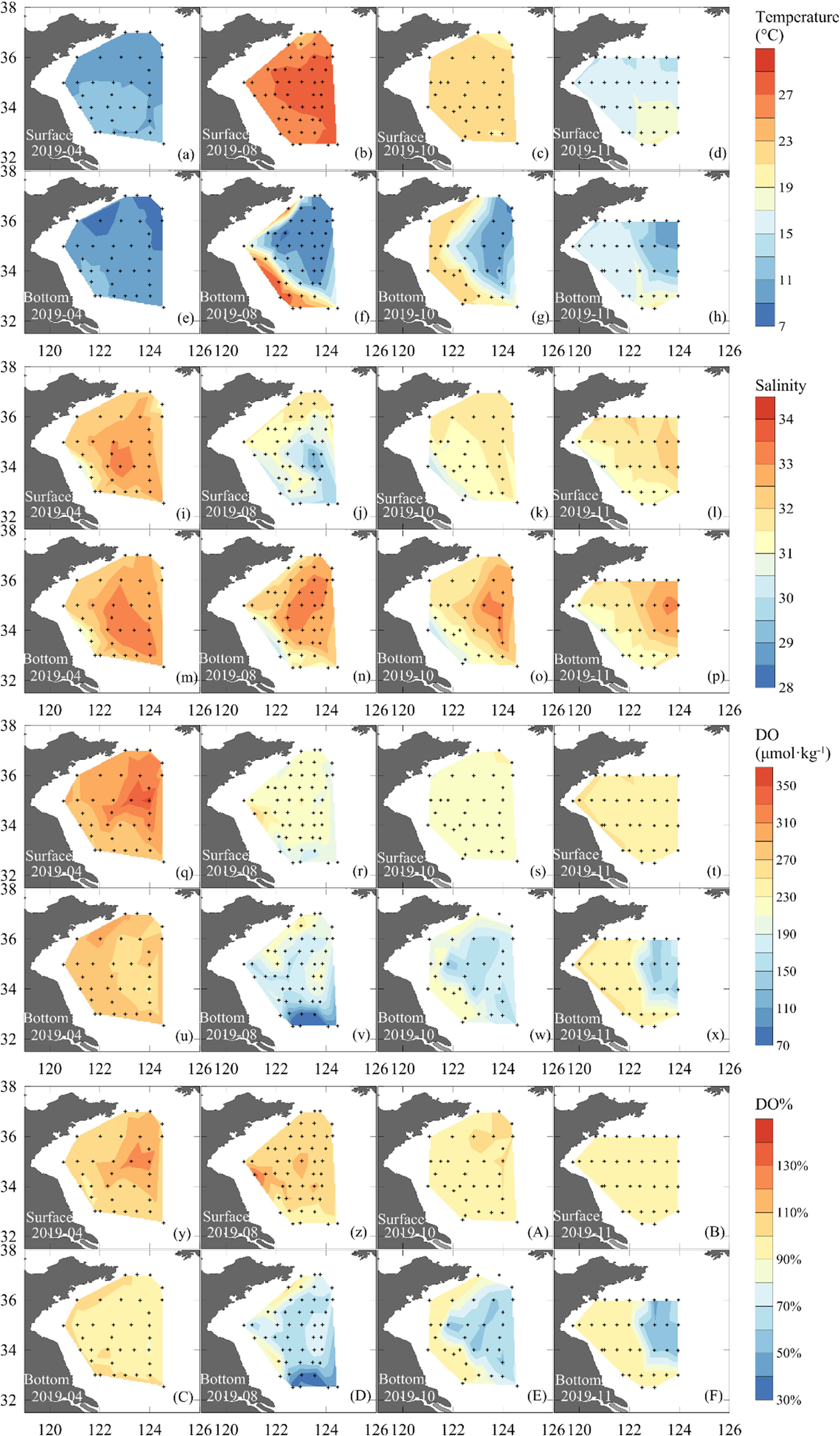 Surface and bottom distribution of water temperature (a-h), salinity (i-p), DO (q-x), and DO% (y-z, A-F) during seasonal mapping cruises carried out in 2019.