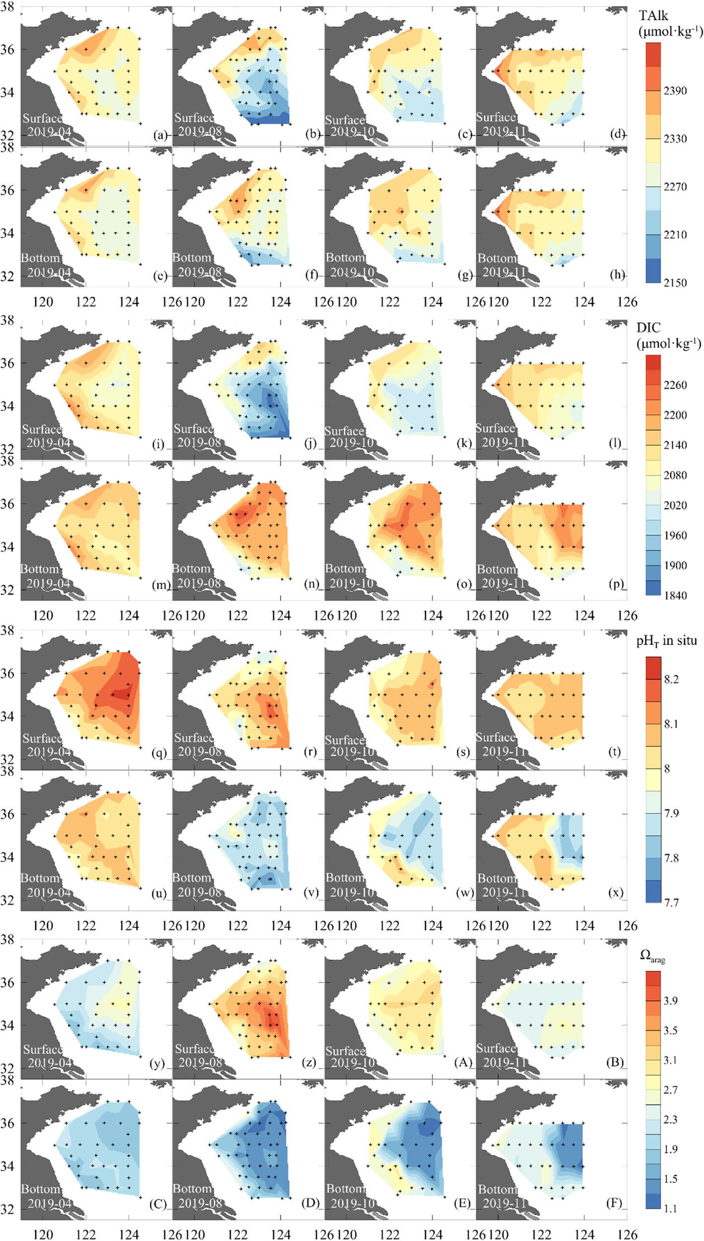 Surface and bottom-water distribution of TAlk (a-h), DIC (i-p), pHT(q-x), and aragonite saturation state (Ωarag) (y-z, A-F) during seasonal mapping cruises carried out in 2019.